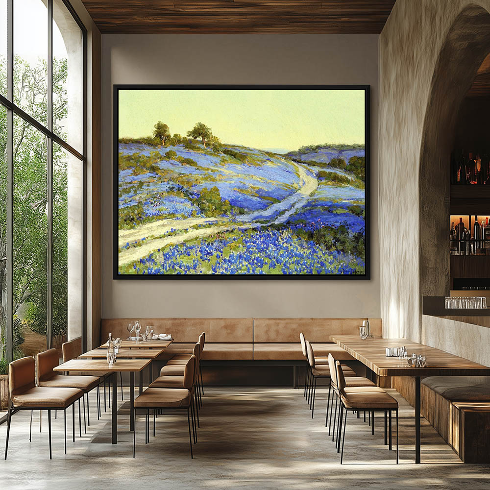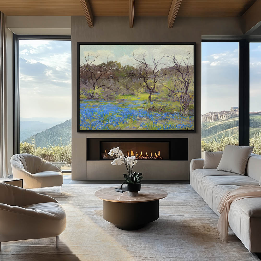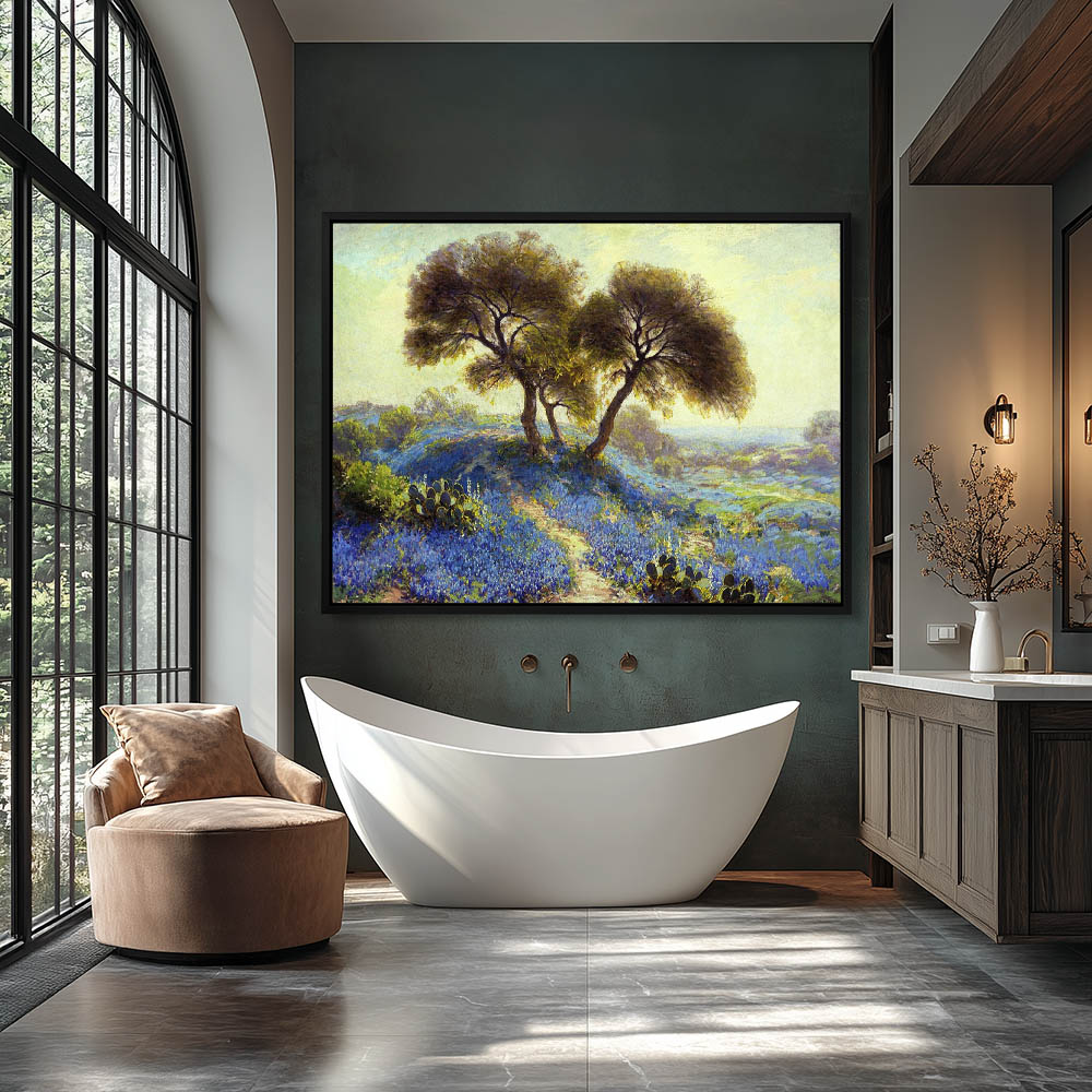 From $29.97Morning sunlight on a landscape with bluebonnets and hilltop oak trees