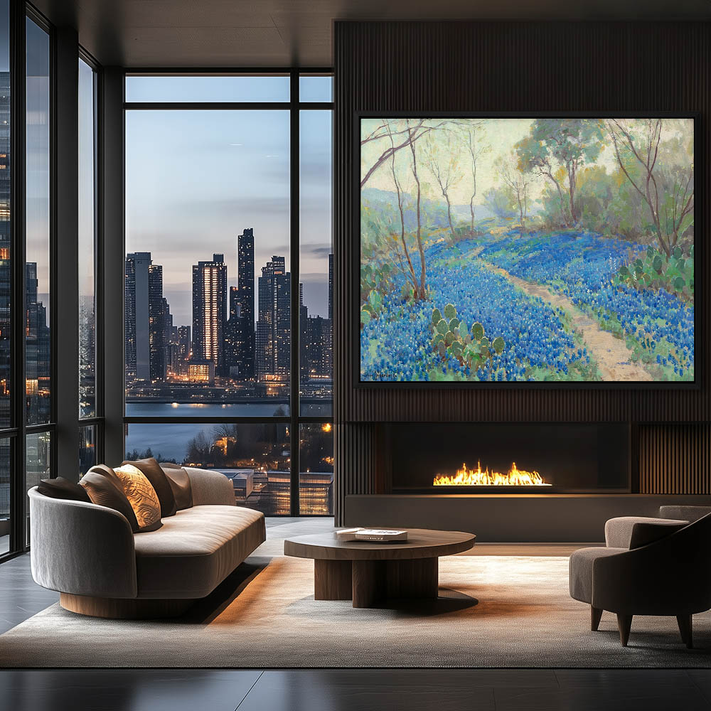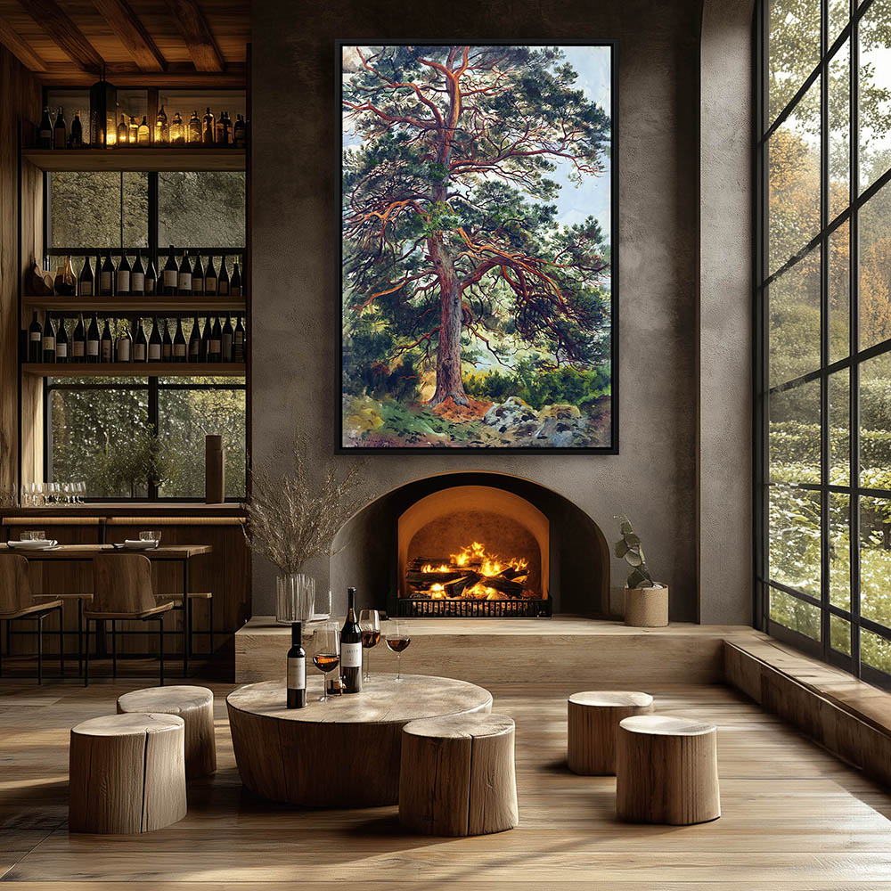 Forest Landscape Painting with a Woodpecker on a Tree in the Woods
