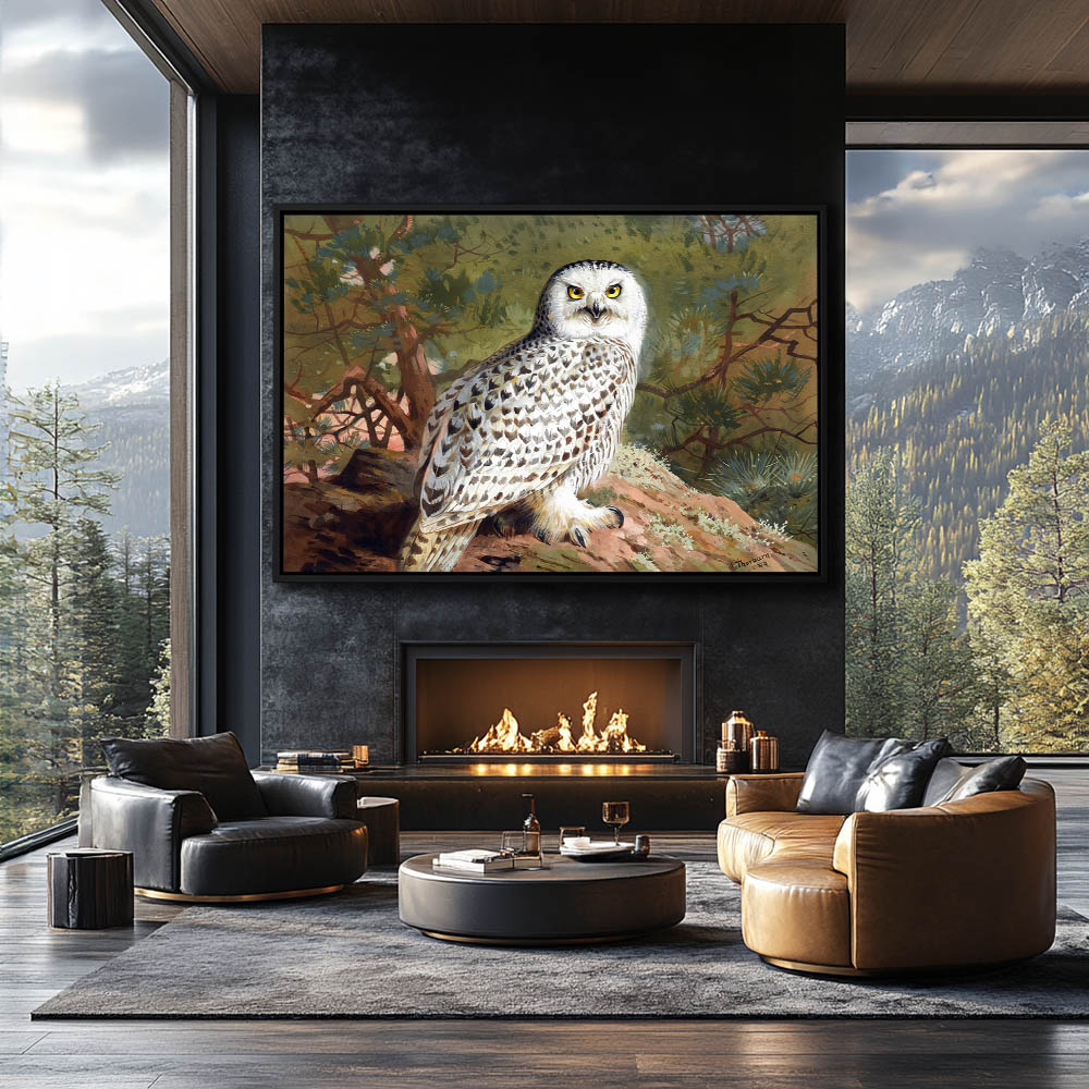 Painting of a Female Snowy Owl on a Rock in the Forest