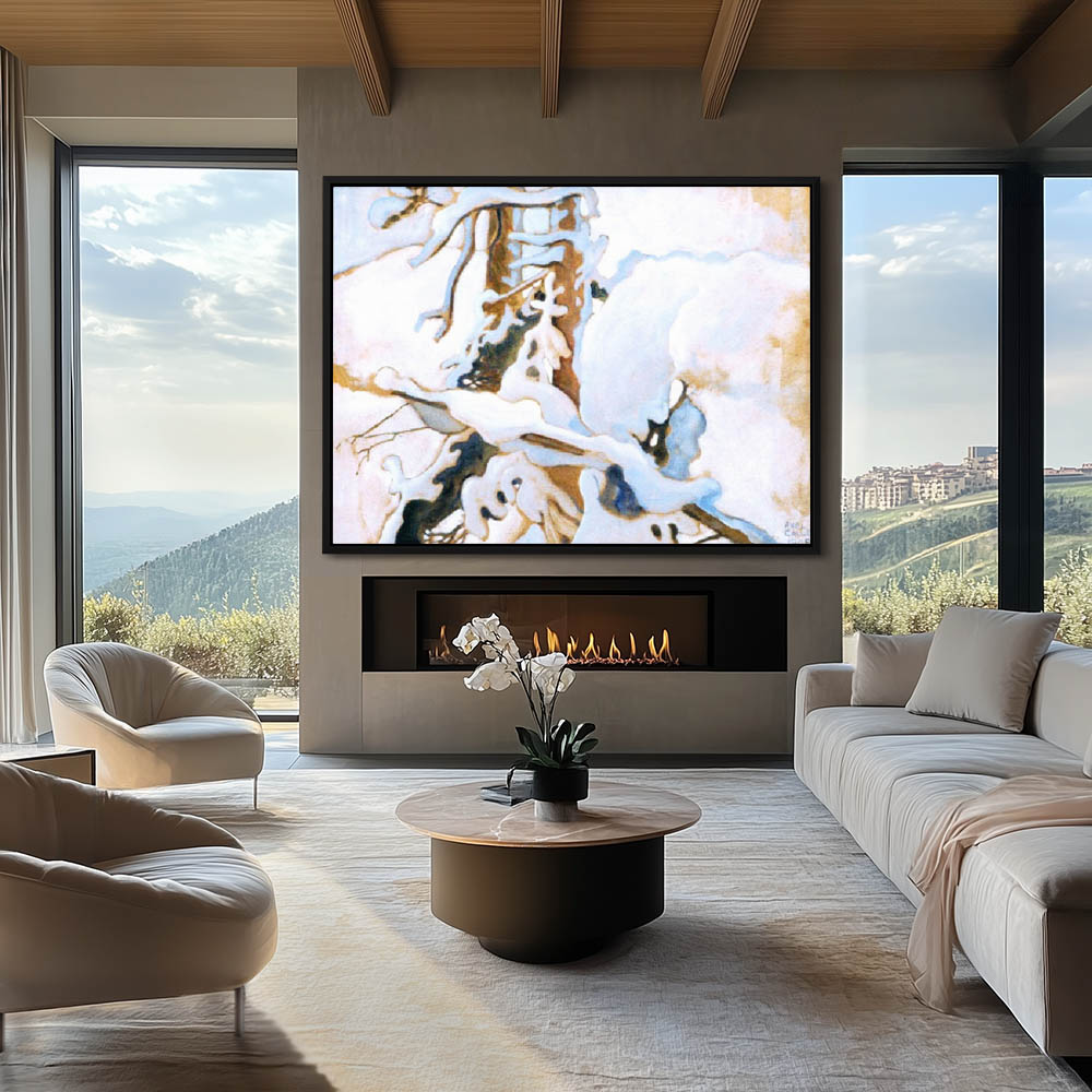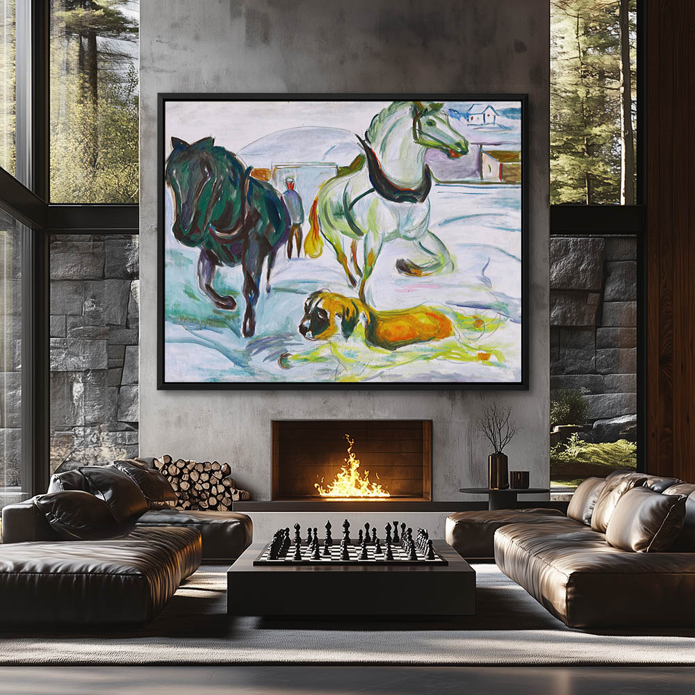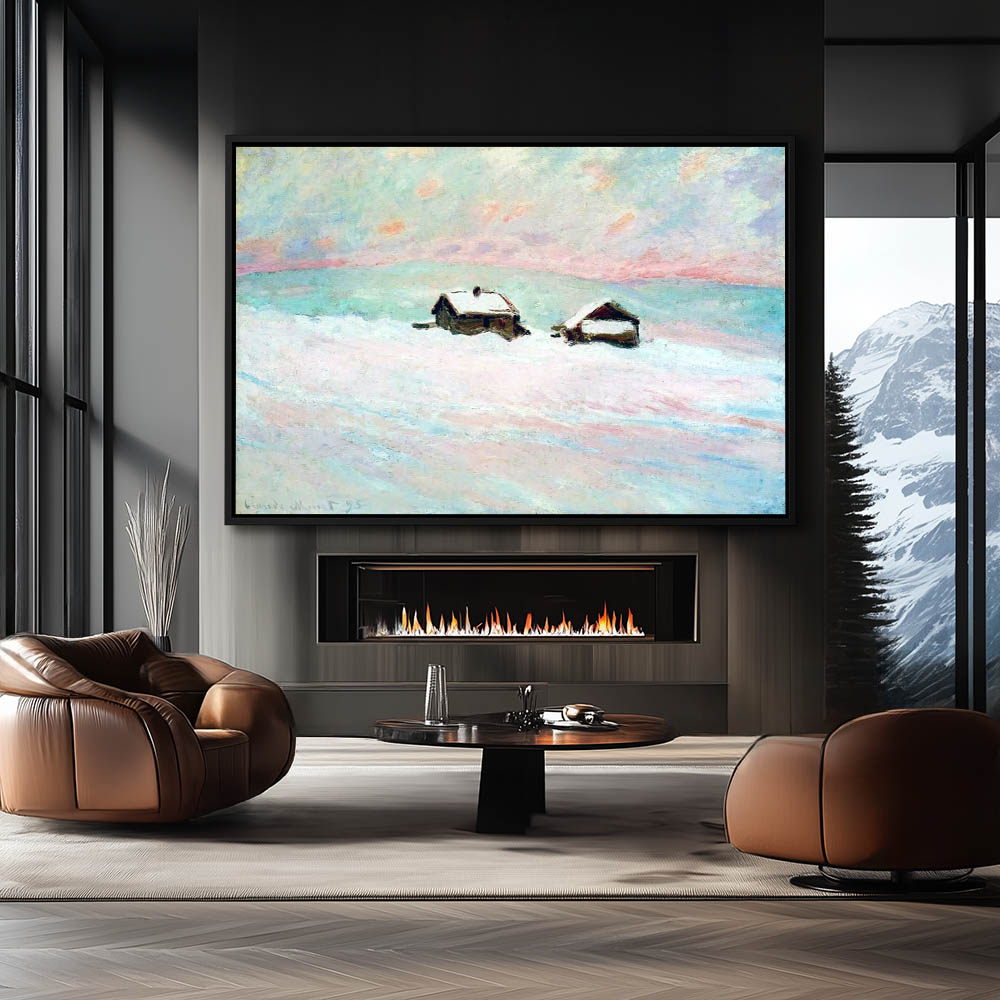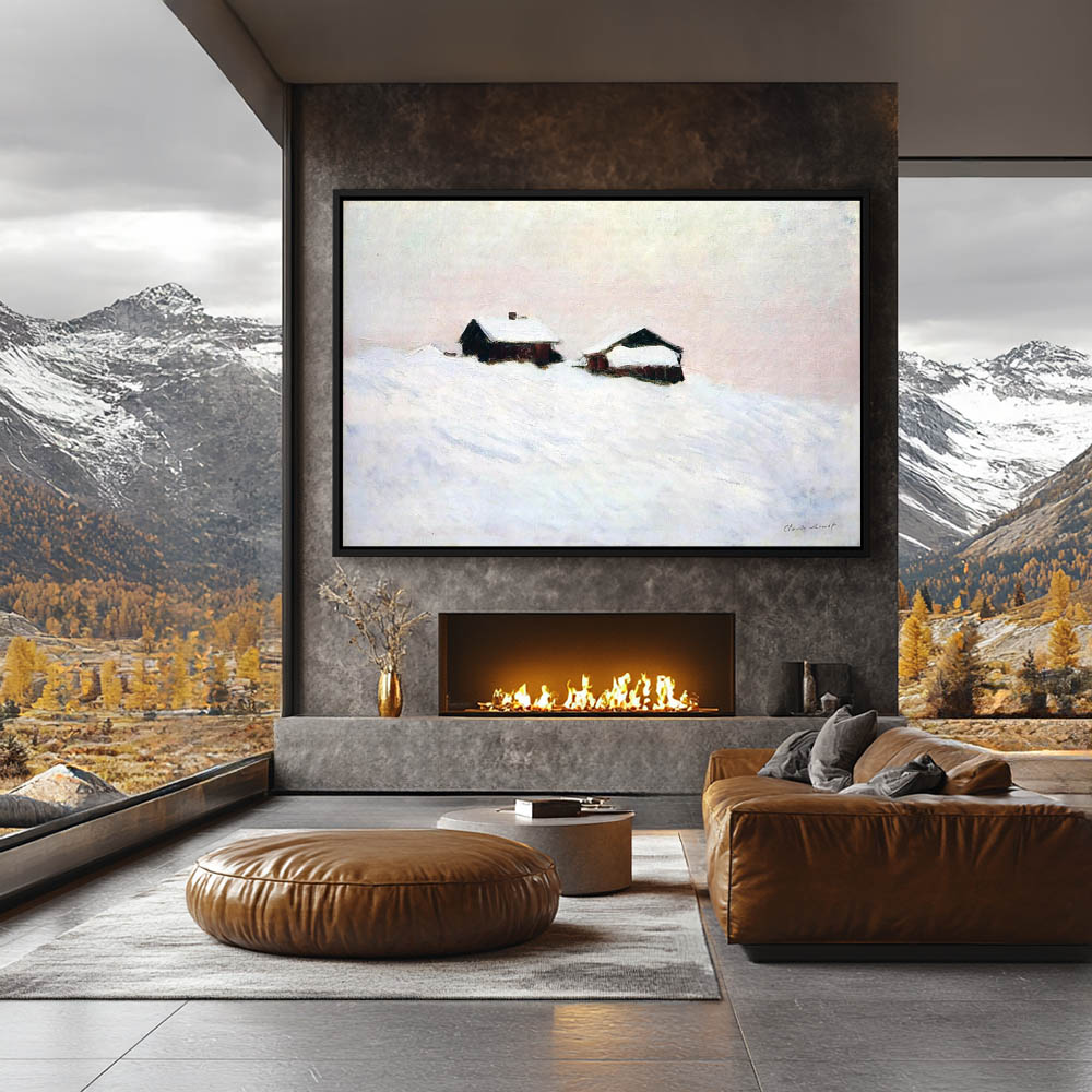 Vintage Landscape Painting with Farmhouses in the Snow in Norway