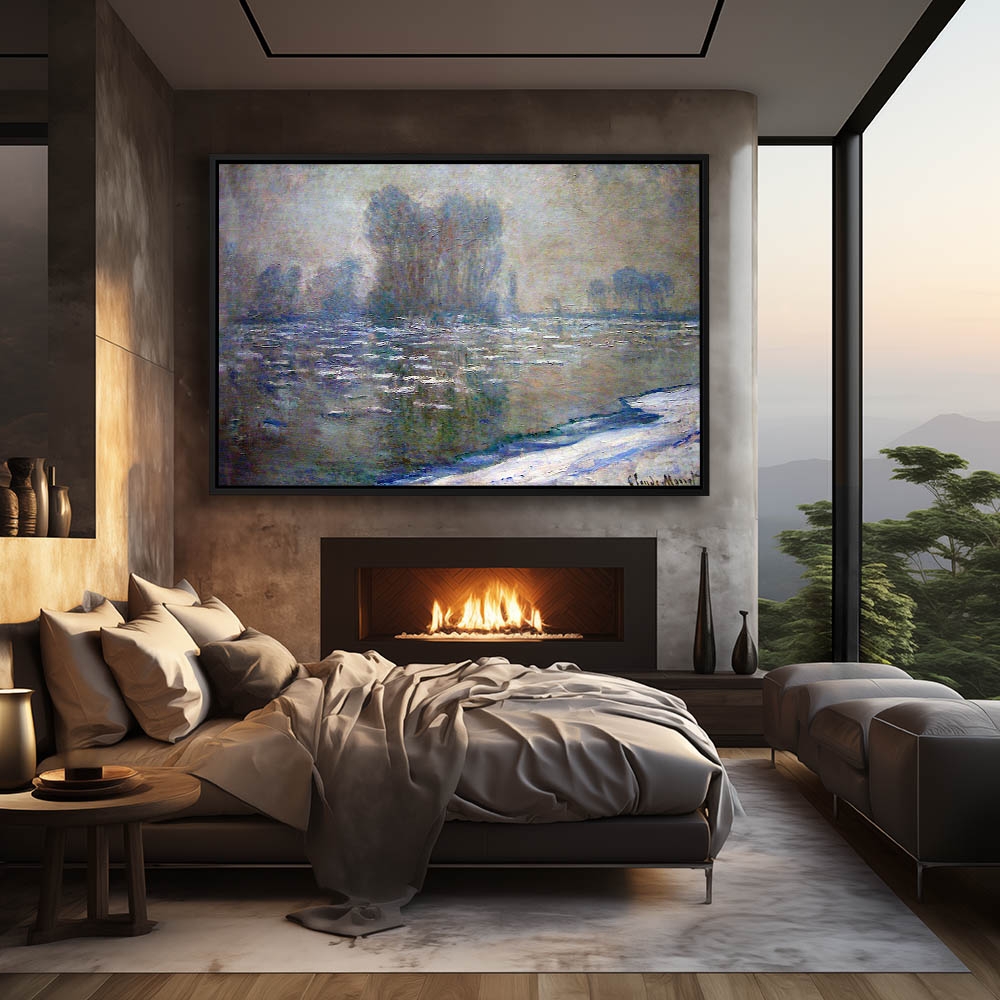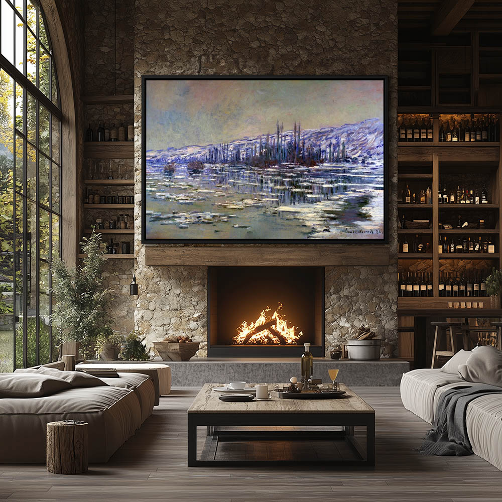 Vintage River Landscape Painting with Ice Flowing in the Water in Winter