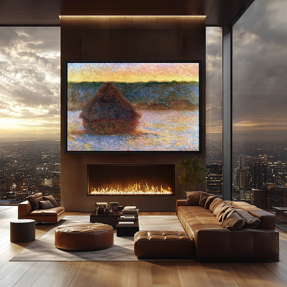 Vintage Landscape Painting with Haystack at Sunset in Frosty Weather