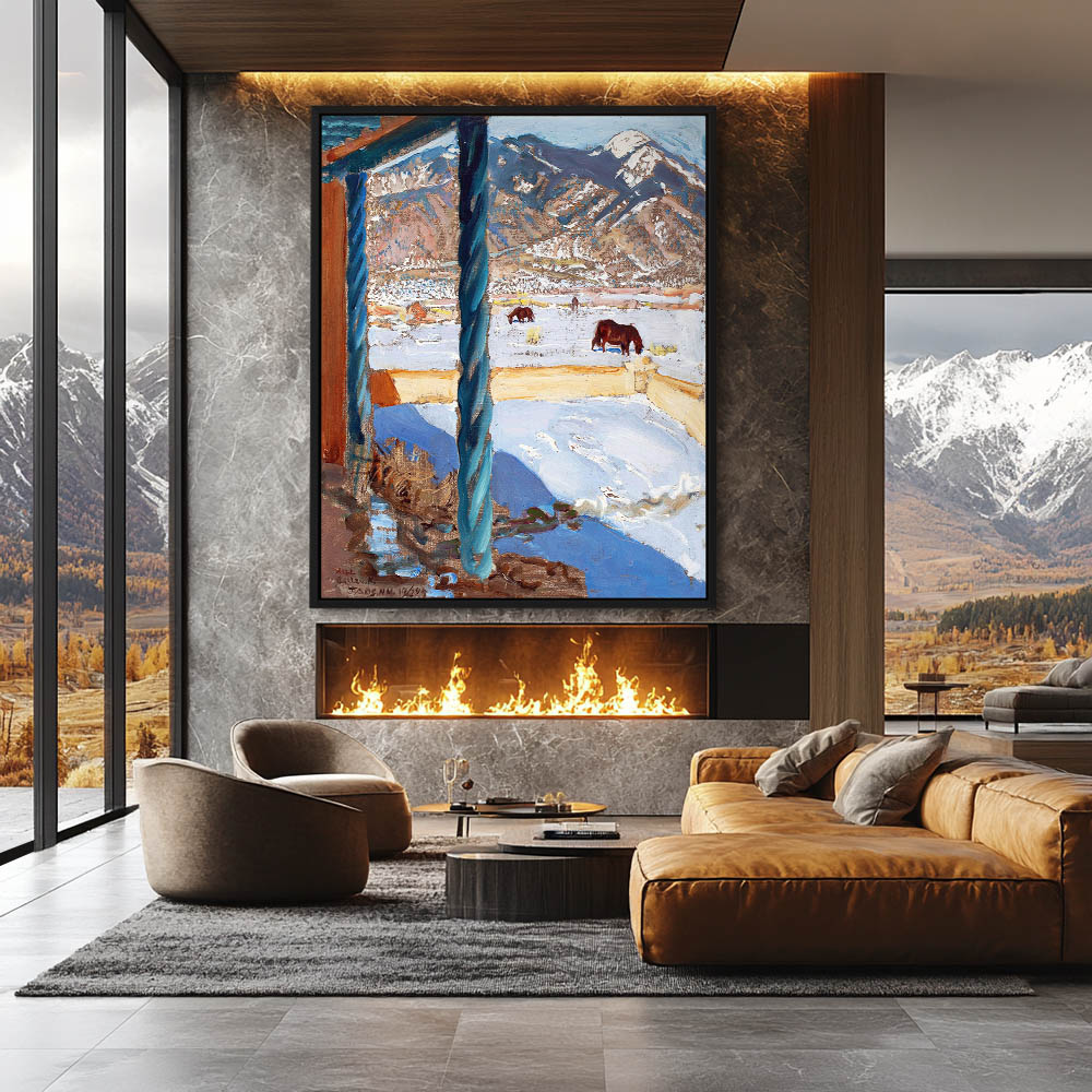Landscape Painting of a Home in Taos New Mexico with Mountains and Snow and Horses
