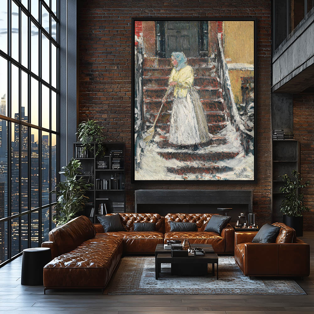 Woman sweeping snow from steps