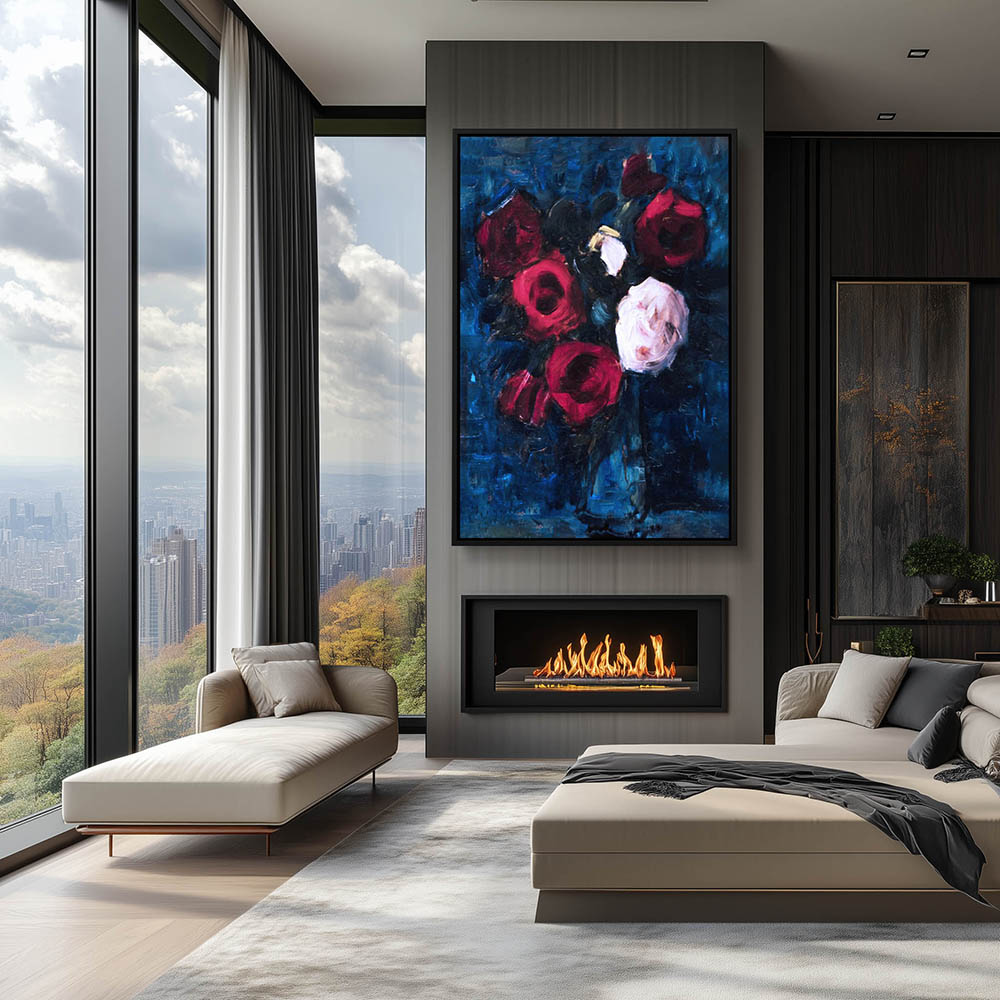 Abstract Still Life Flower Painting with Roses on Blue Back Ground