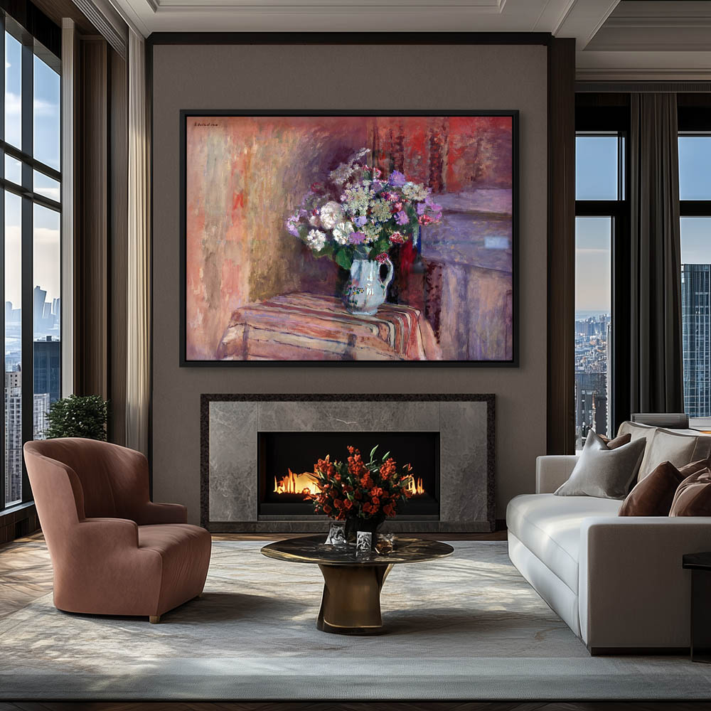 Still Life Flower Painting with Books and a Box of Matches and Bottle