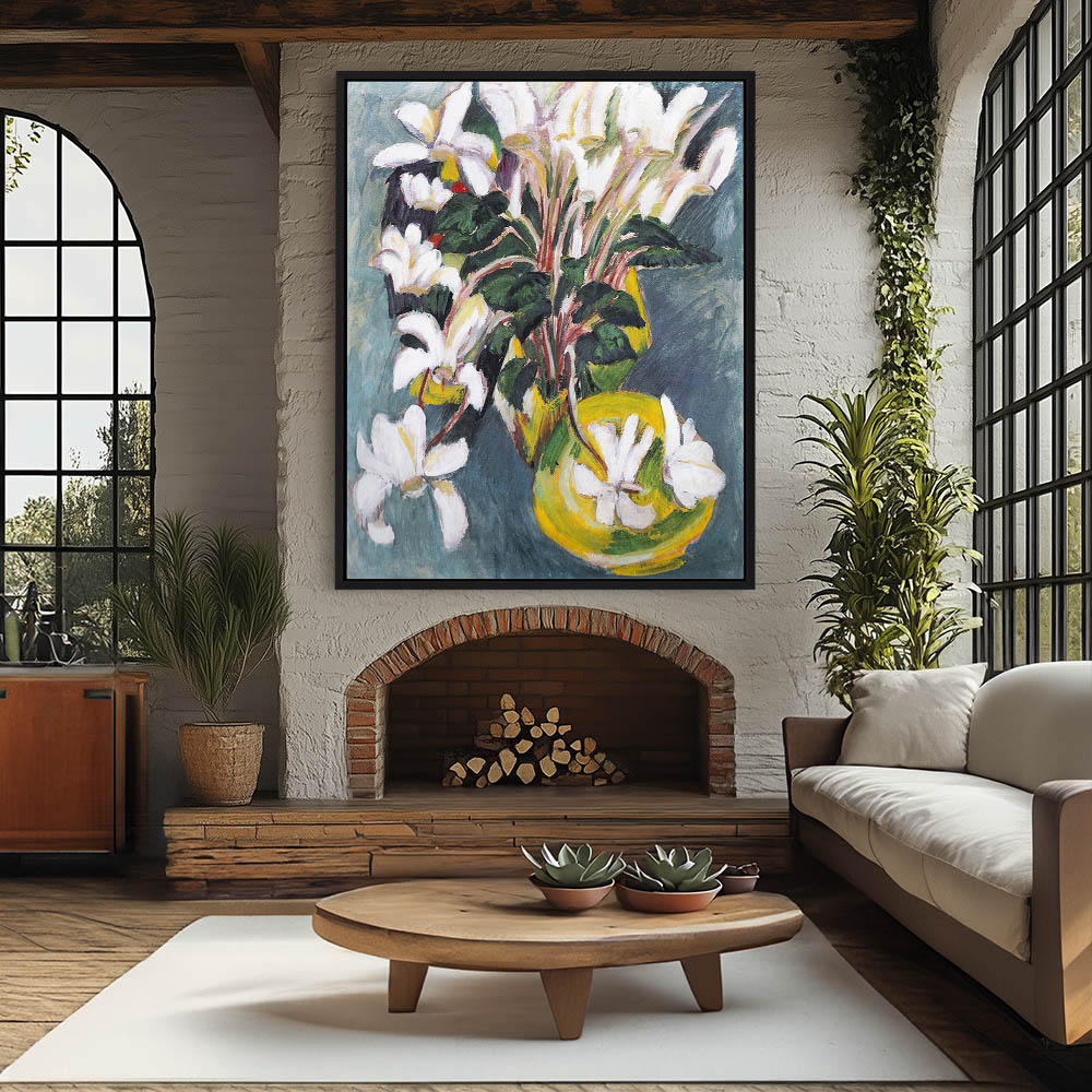Vintage Still Life Painting with Dahlias in a Copper Vase on a Table