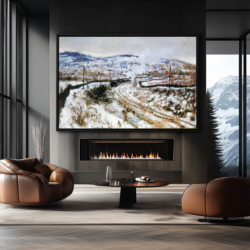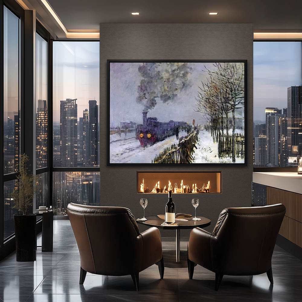 Vintage Landscape Painting with a Train in Winter with Snow Covered Ground