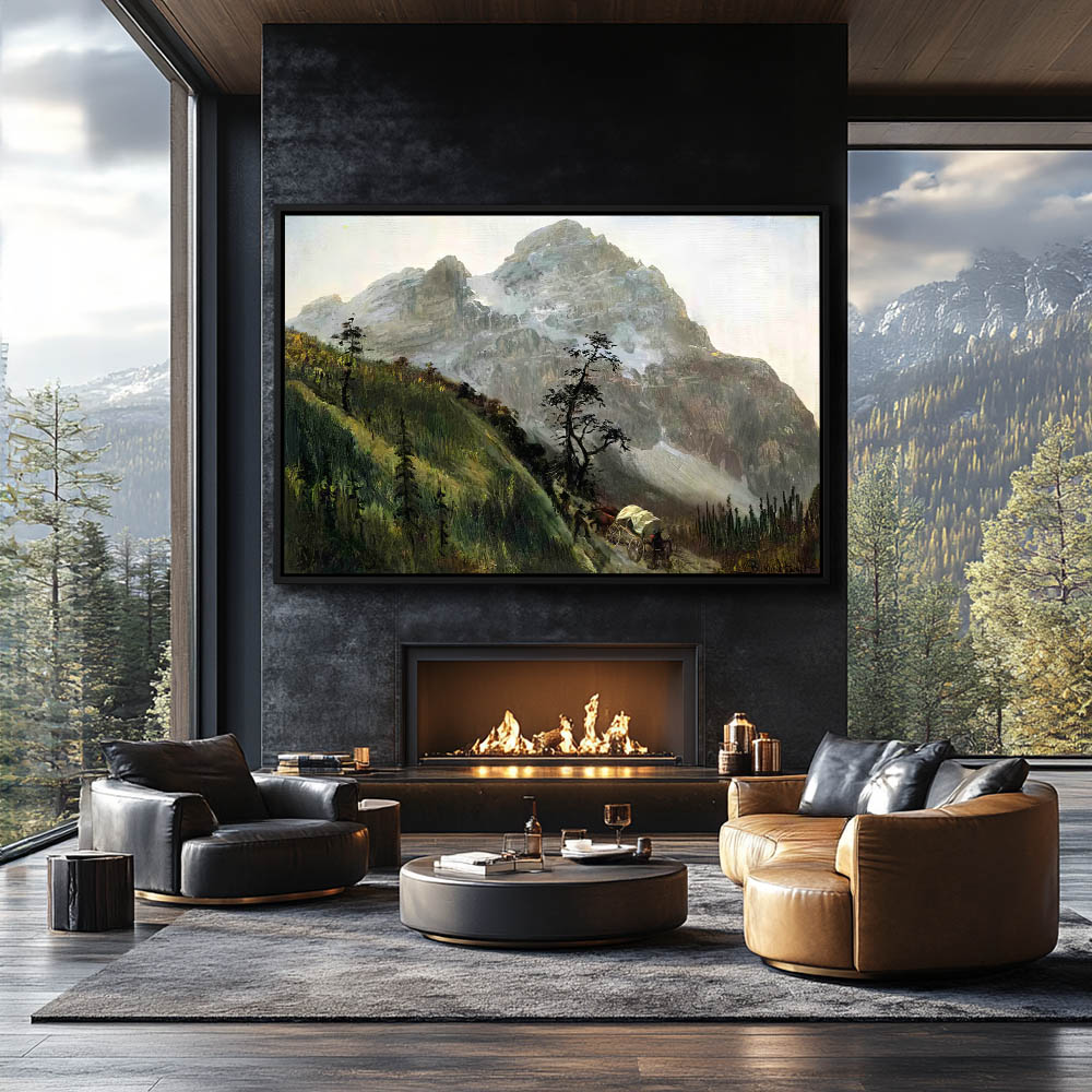 Horses and wagon traveling along a trail in the mountains