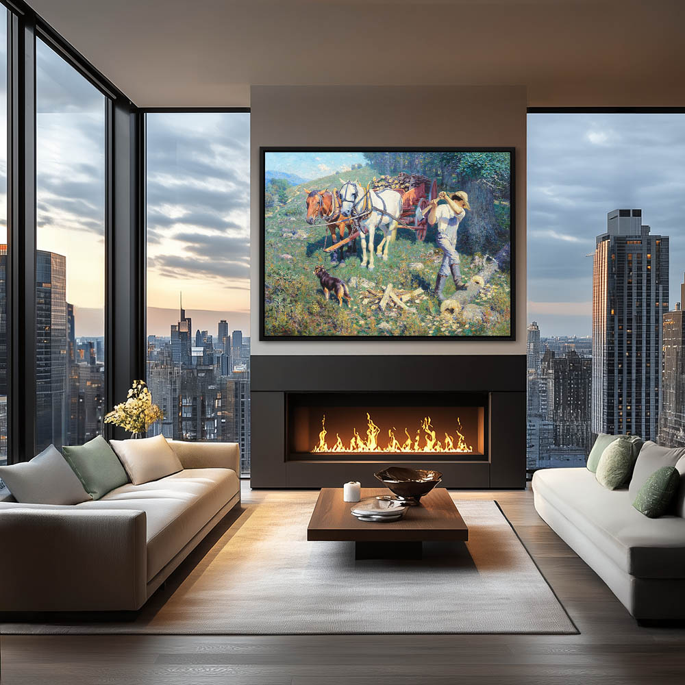 Man chopping fire wood to load on a horse drawn cart
