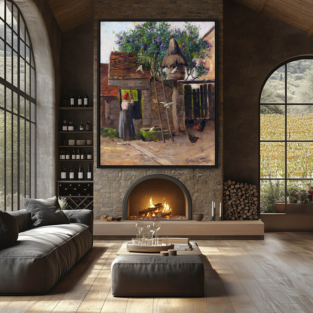Vintage Farm Landscape Painting with a Woman Drawing Water from the Well