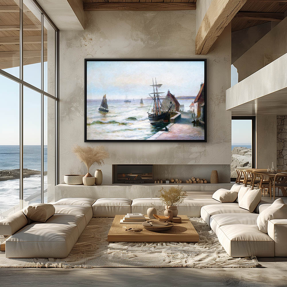 Vintage Harbor Sea Scape Painting with Sailboats at Sea