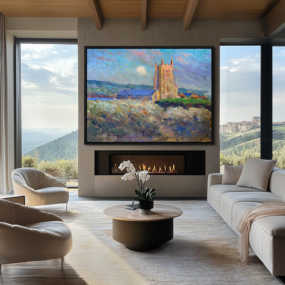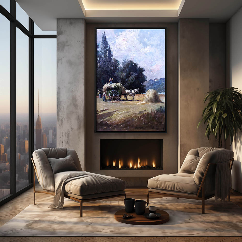 Vintage Landscape Painting with a Horse and Wagon Moving Hay