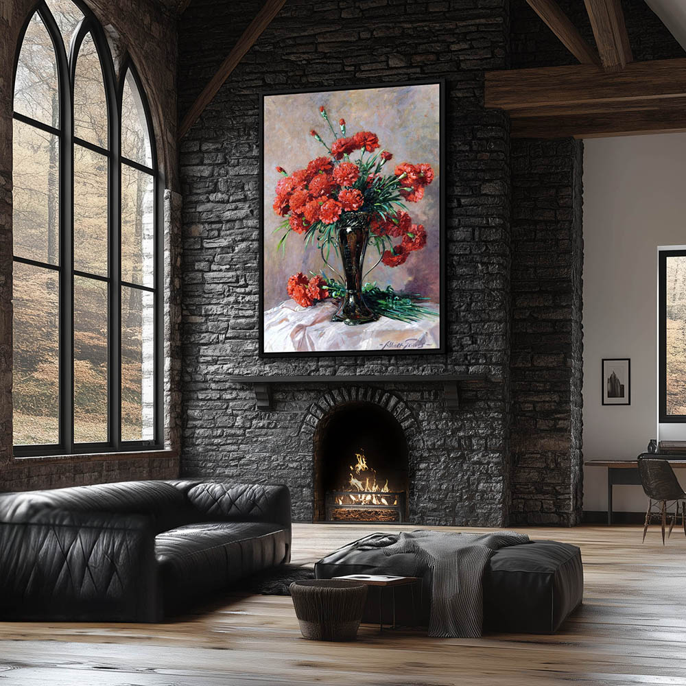 Vintage Still Life Flower Painting with Carnations in a Basket