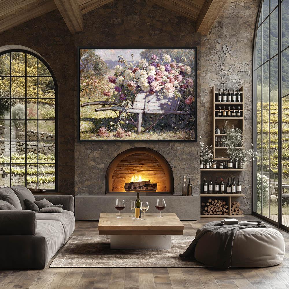 Vintage Flower Painting of Flowers in a Wheel Barrow
