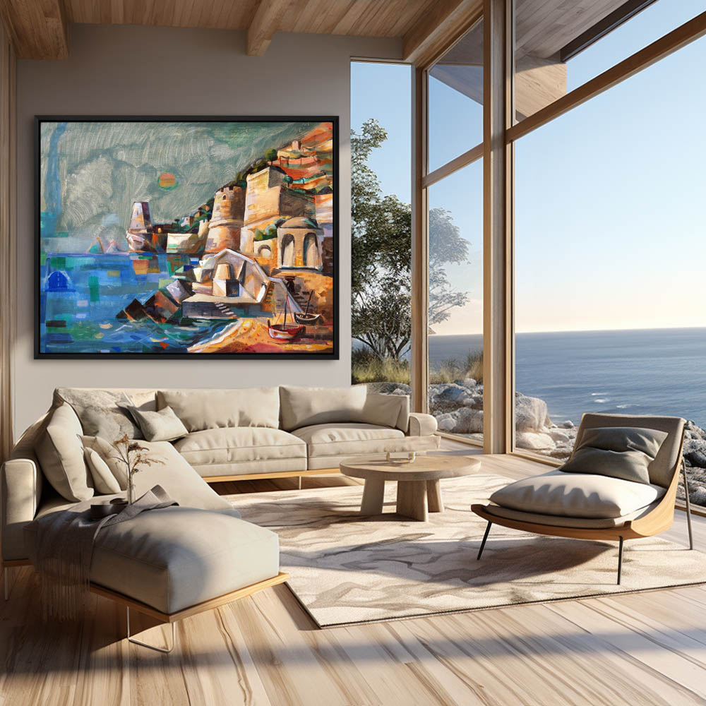 Abstract Coastal Painting with a Village by the Sea