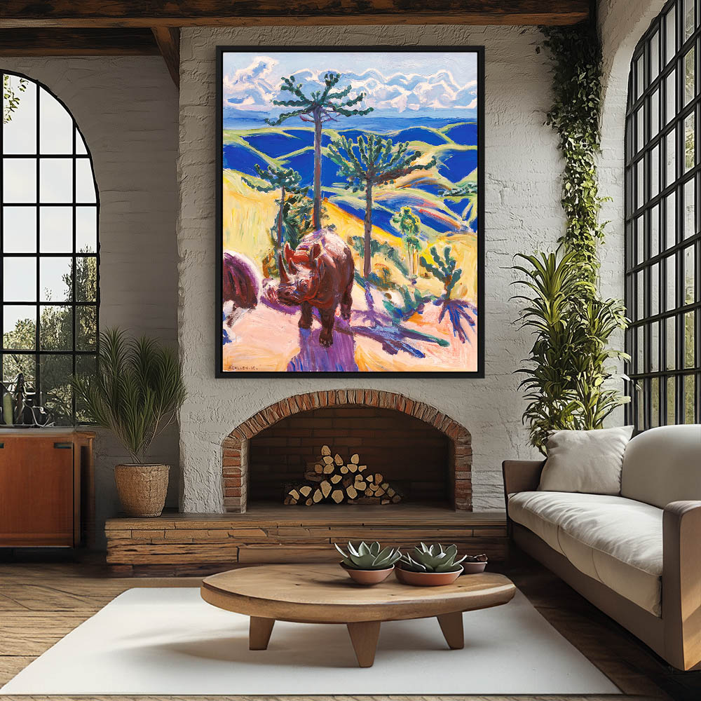 Abstract Landscape Painting of Africa withRhinoceros and a Euphorbia Trees and Hills