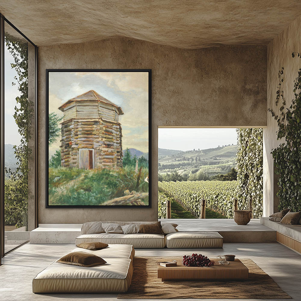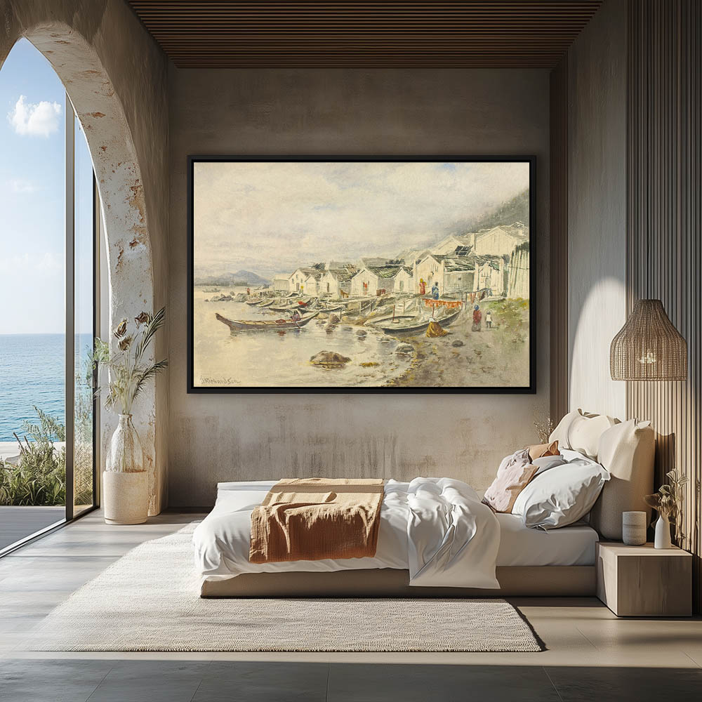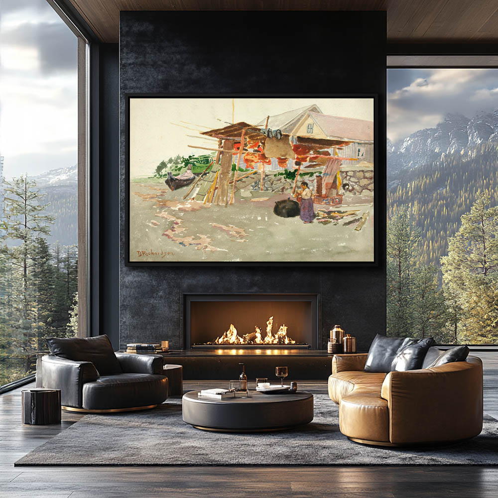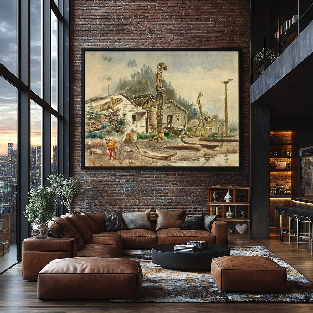 Waterfront village scene, with canoes, totems and structures along the shoreline