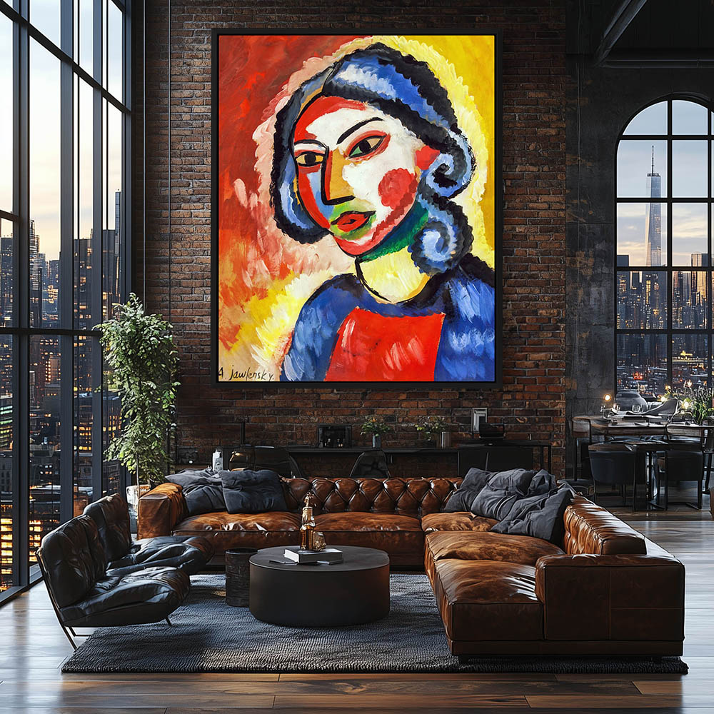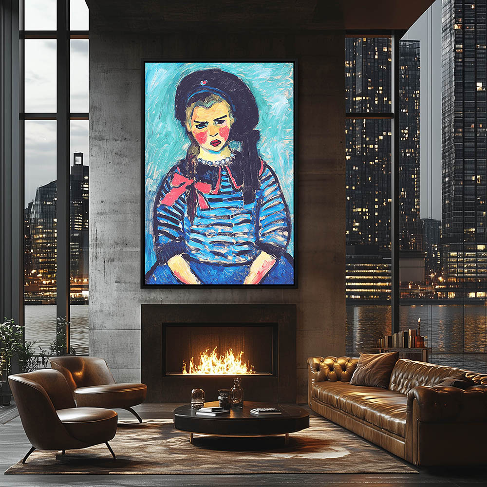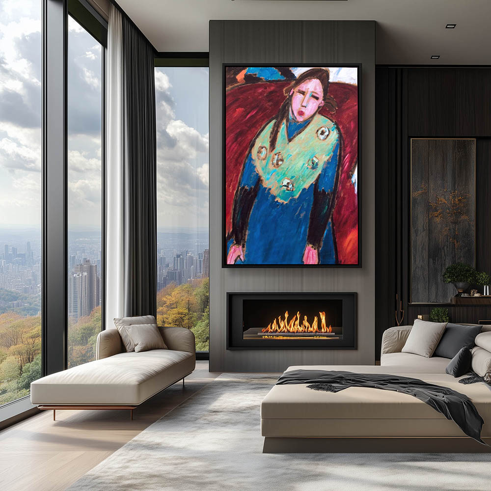 From $29.97Abstract Figurative Portrait Painting of a Girl Dressed in Blue on Red Background