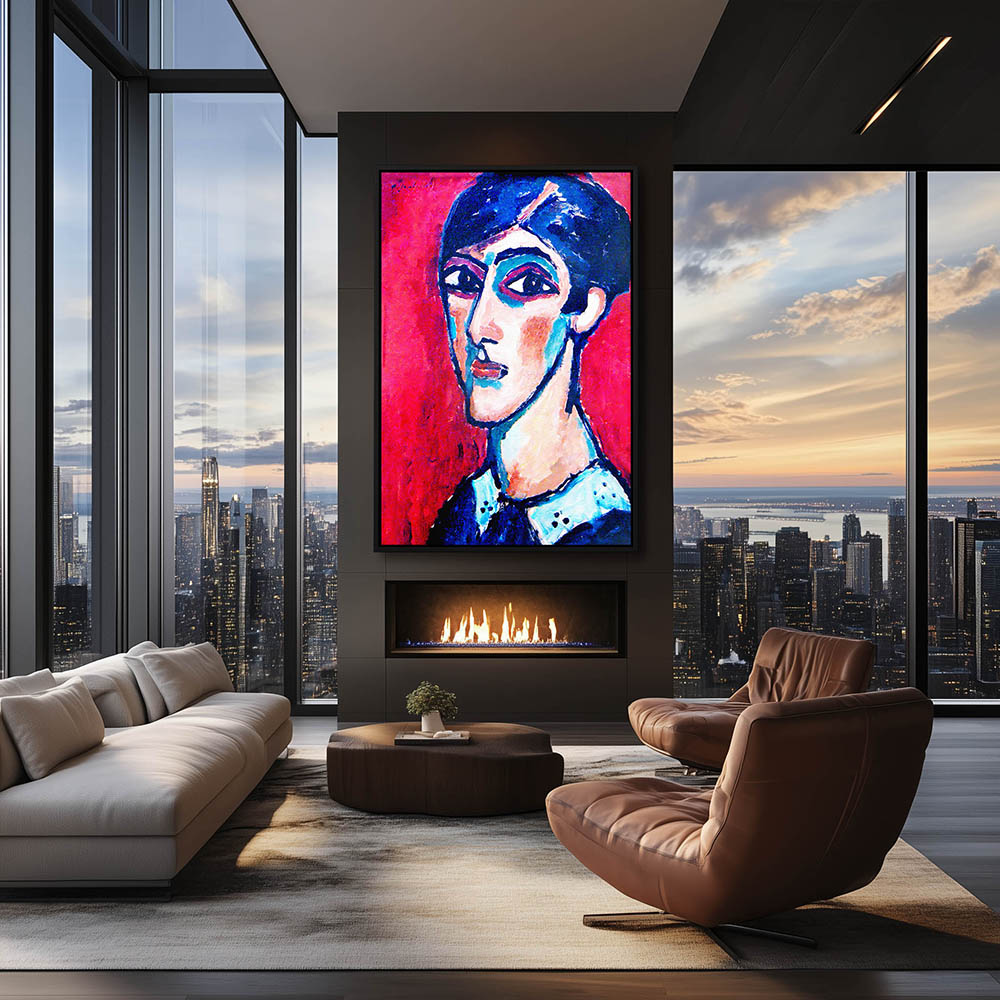 Abstract Figurative Woman in Blue with Red Background