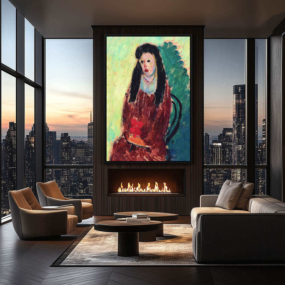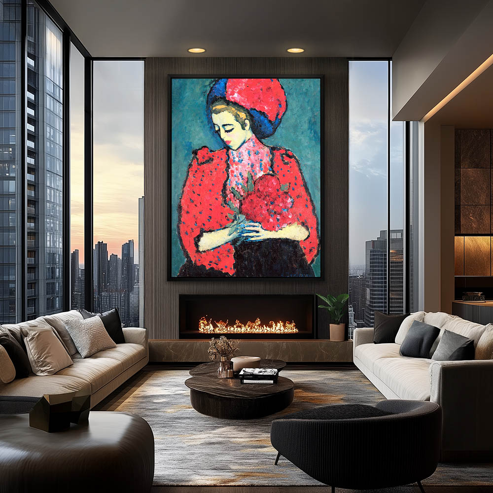 Abstract Figurative Girl with Flowers and Big Hat and Red Blouse