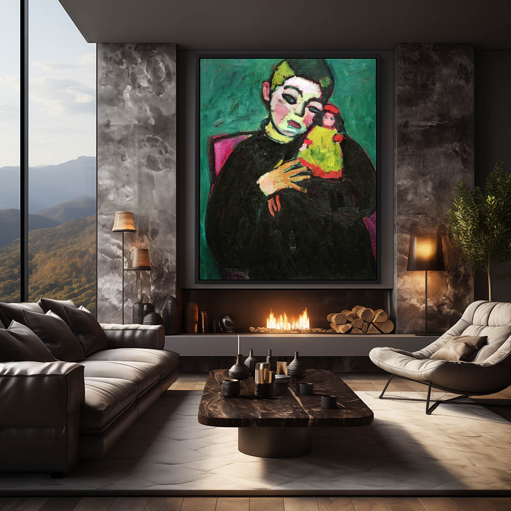 Abstract Figurative Portrait Painting of a Boy Holding a Doll on Green Background