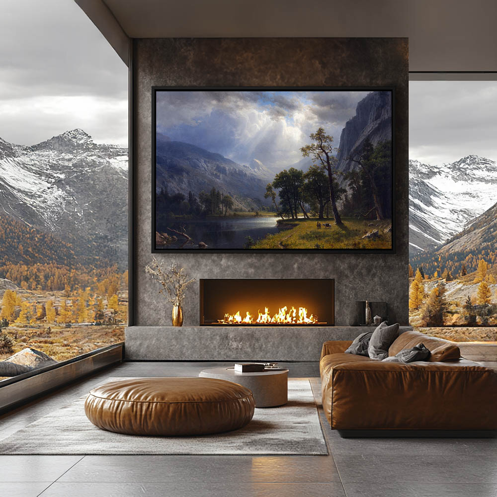 Vast landscape with sun cutting through the clouds and spilling across the mounain range to the river below. Sheer cliffs and tall trees line the river where figures lead a horse to the river’s edge.