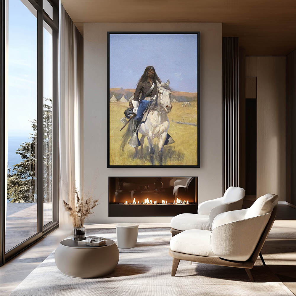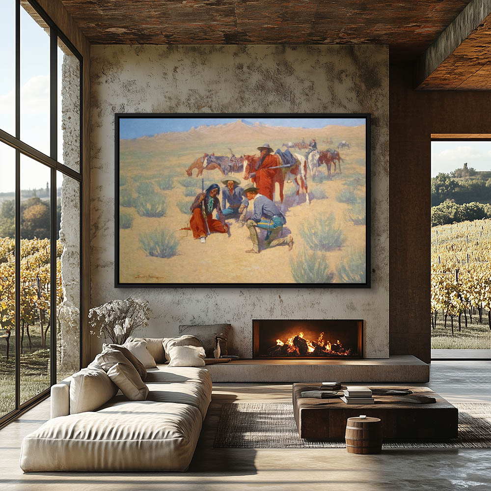 Indians on the shore and in a canoe come to meet explorers coming down the river in Yosemite Valley