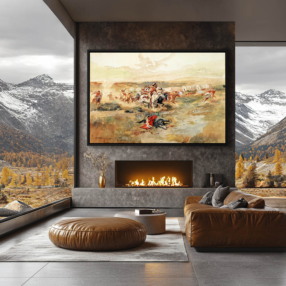 Indians on horseback attacking a wagon train