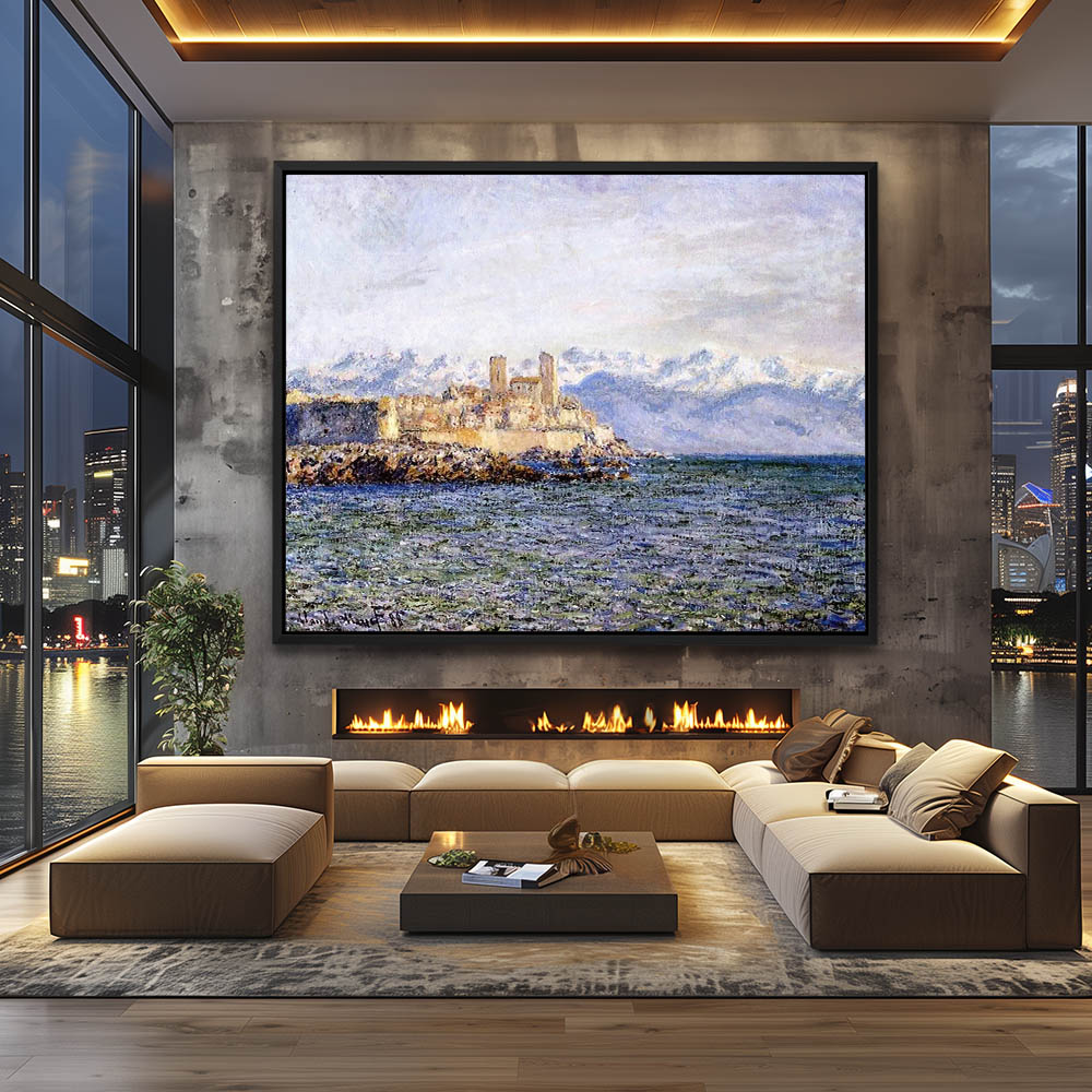 Vintage Seascape Painting of The Old Fort at the Antibes Seashore with the Alps in the Distance