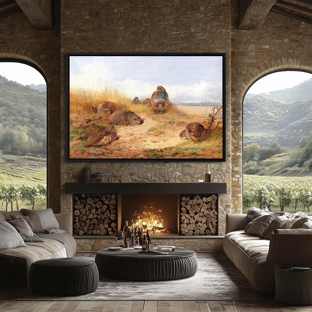 Painting of a Covey of Grey Partridge Gamebirds in the Grass
