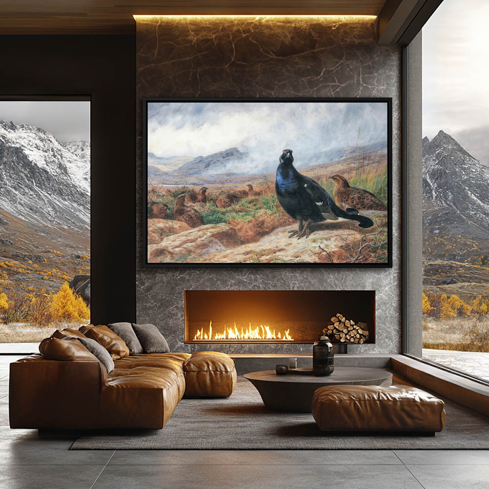 Forest Landscape Painting with Black Game Gamebirds on a Limb