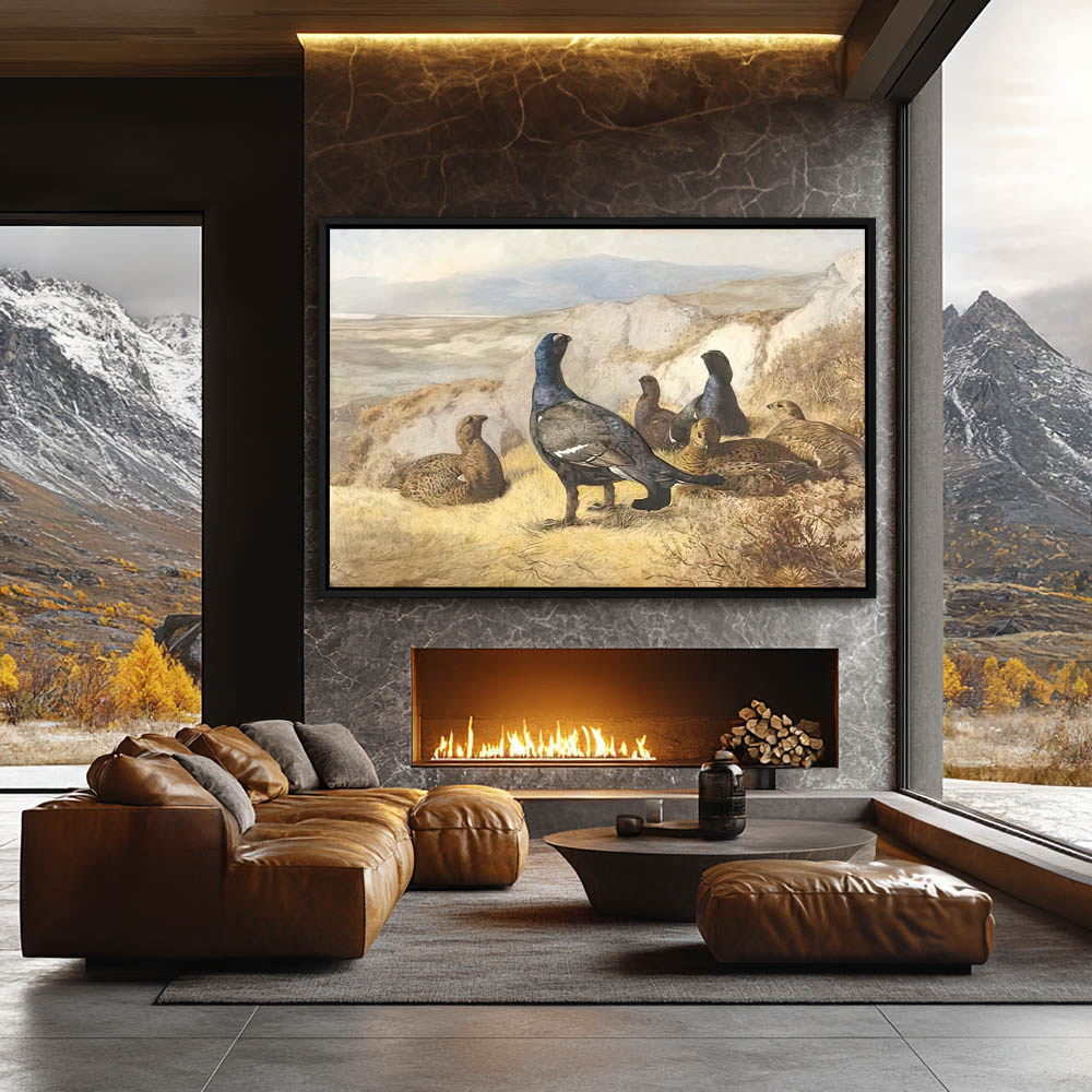 Painting of Black Grouse Gamebirds Resting in the Grass of an Open Landscape