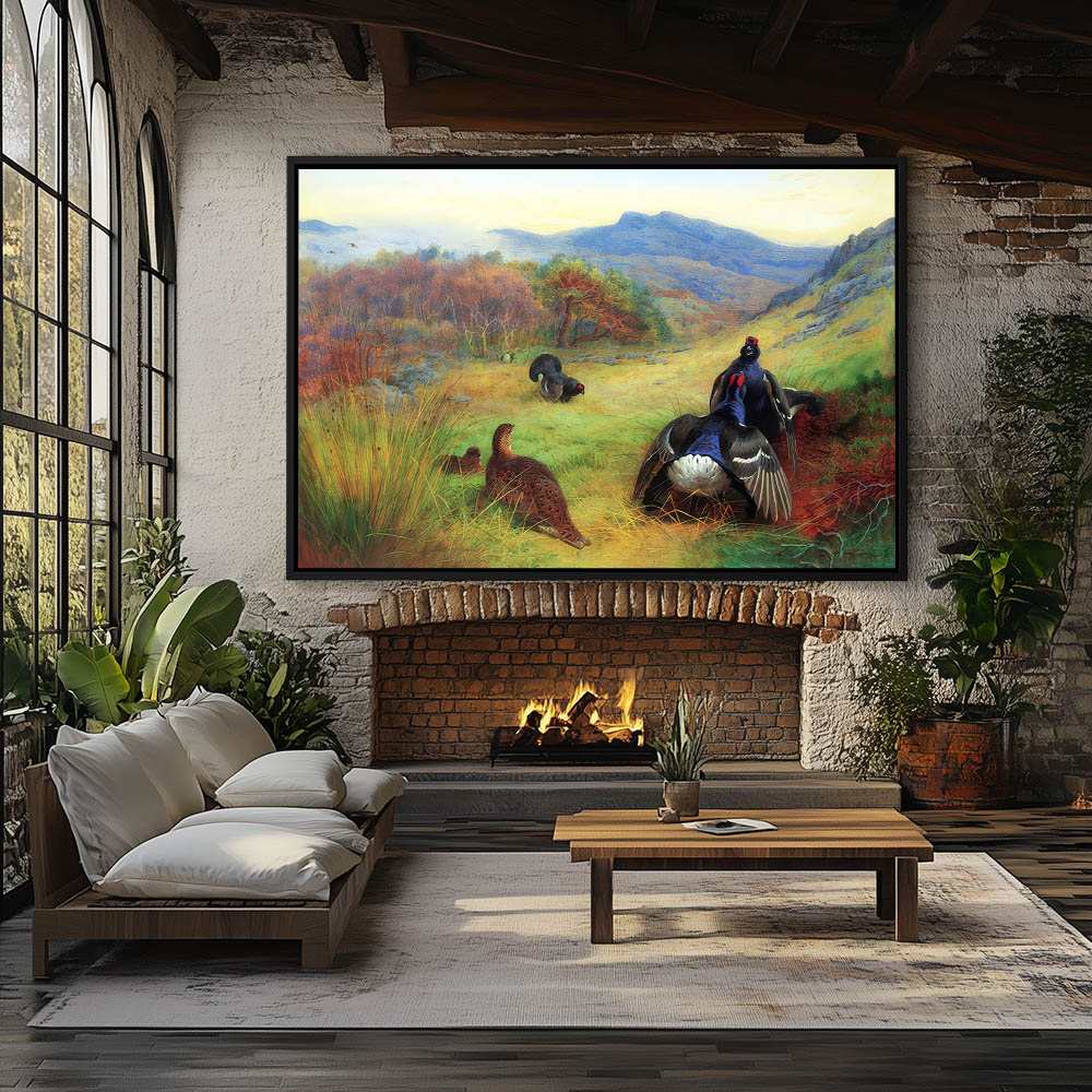 Landscape Painting with Blackcock Gamebirds Fighting with the Females Watching
