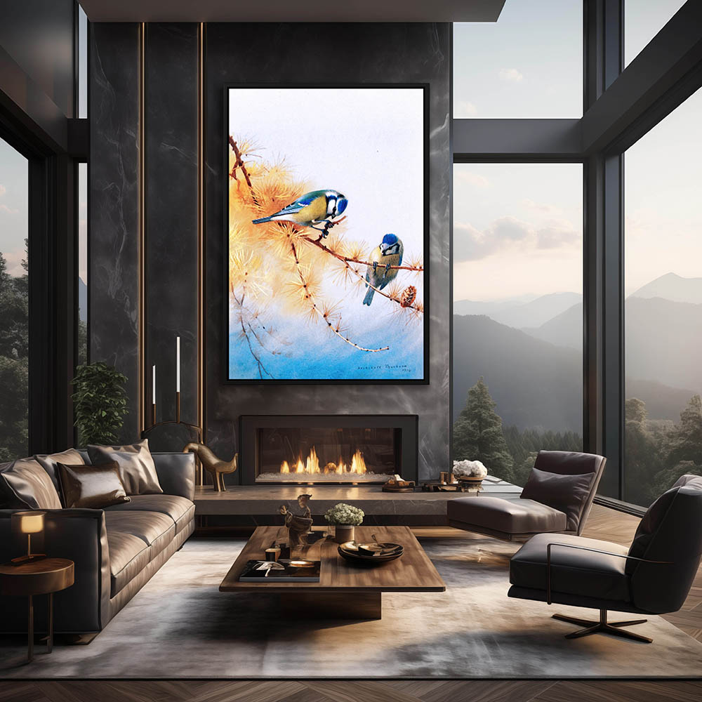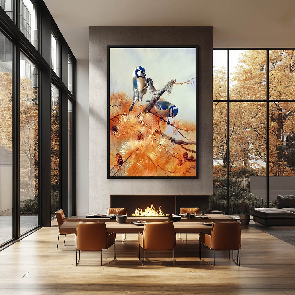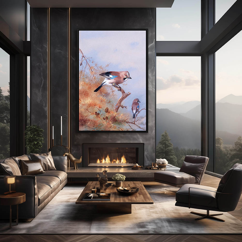 Painting of Blue Winged Jay Birds Resting on the Tree Limbs