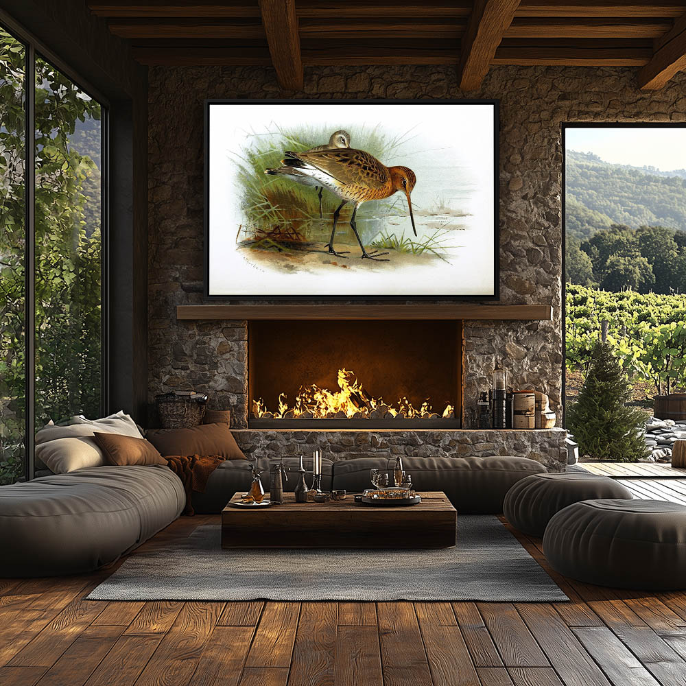 Painting of Blacktailed Godwit Birds on the Sand by the Grass