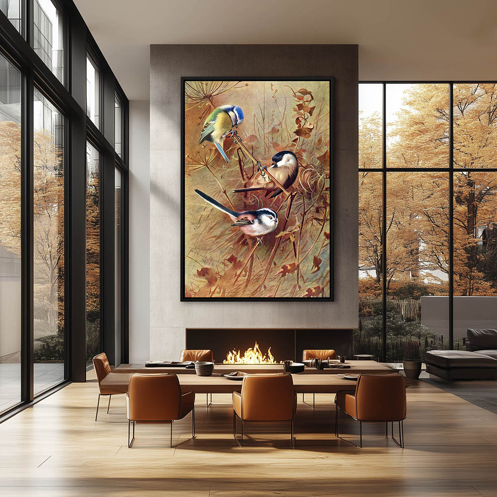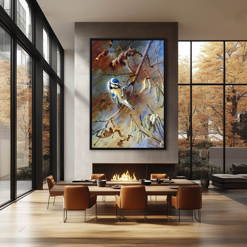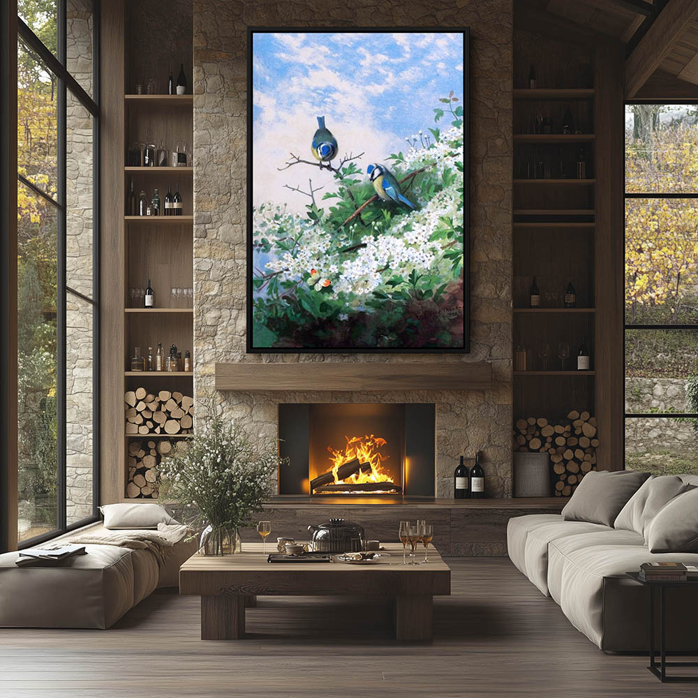 Painting of Blue Tits on a Limb in Bloom with a Butterfly