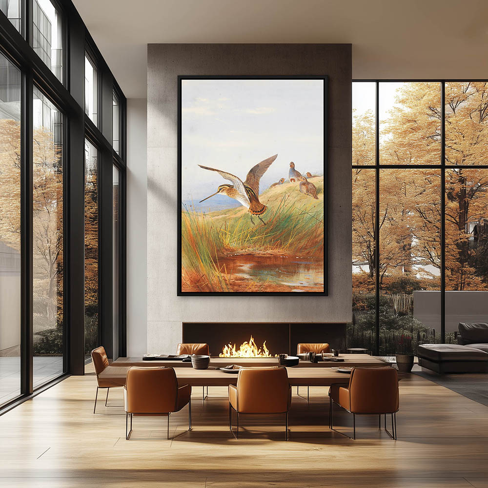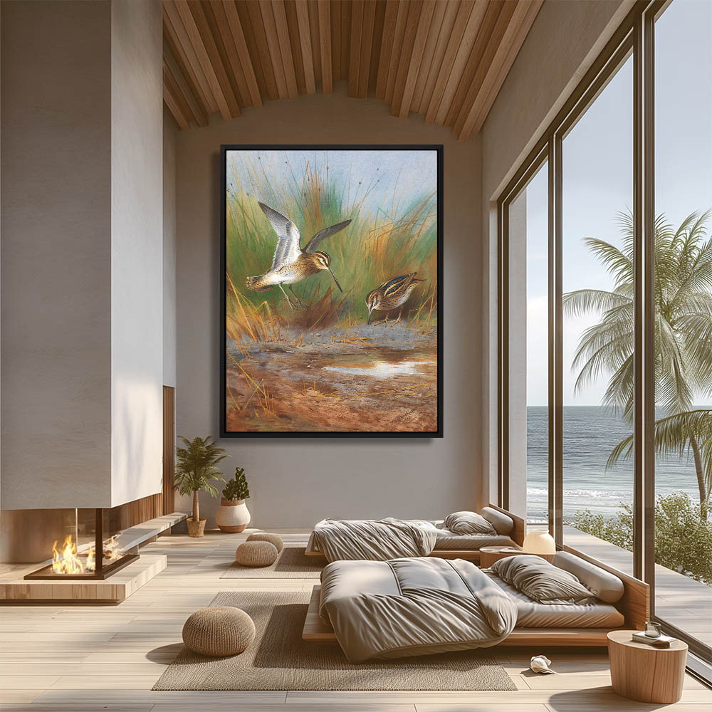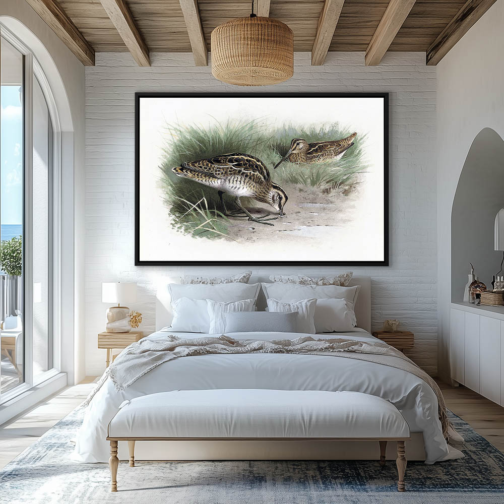 Painting of the Common Snipe and the Jack Snipe in the Grass Near a Pool of Water