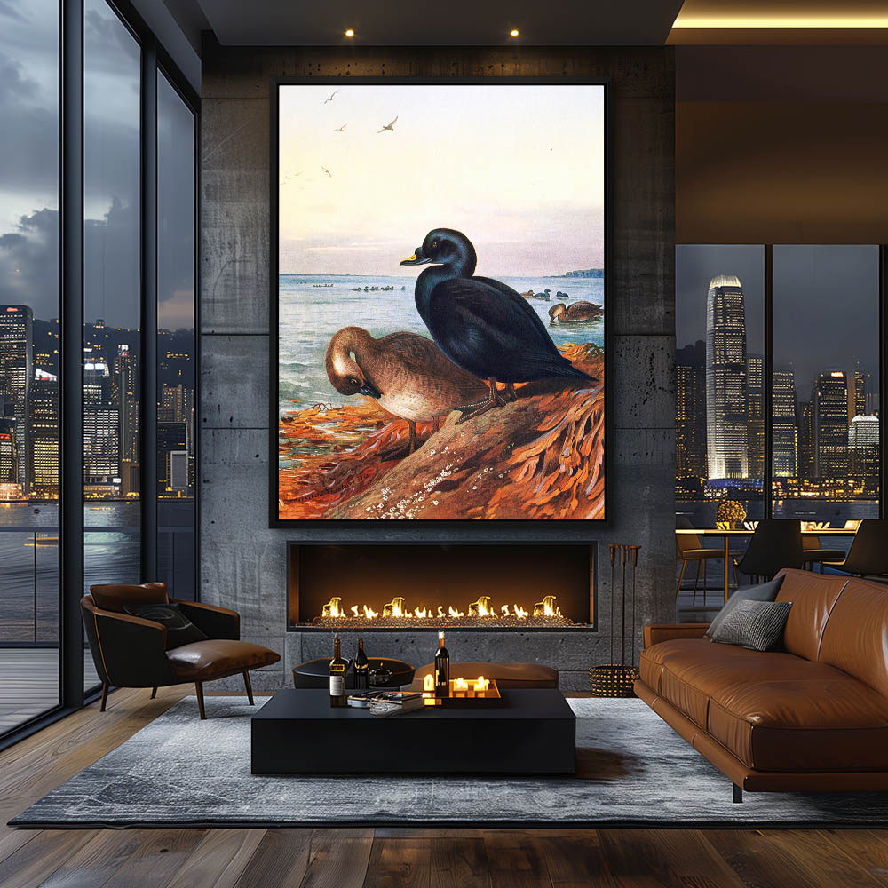 Coastal Landscape Painting with Ducks on a Rock and Swimming at Sea