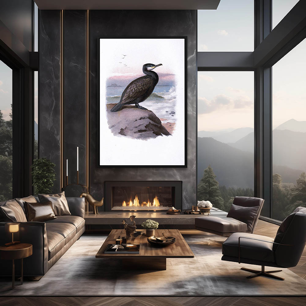 Painting of a Cormorant Water Bird Resting on a Rock Overlooking the Waves