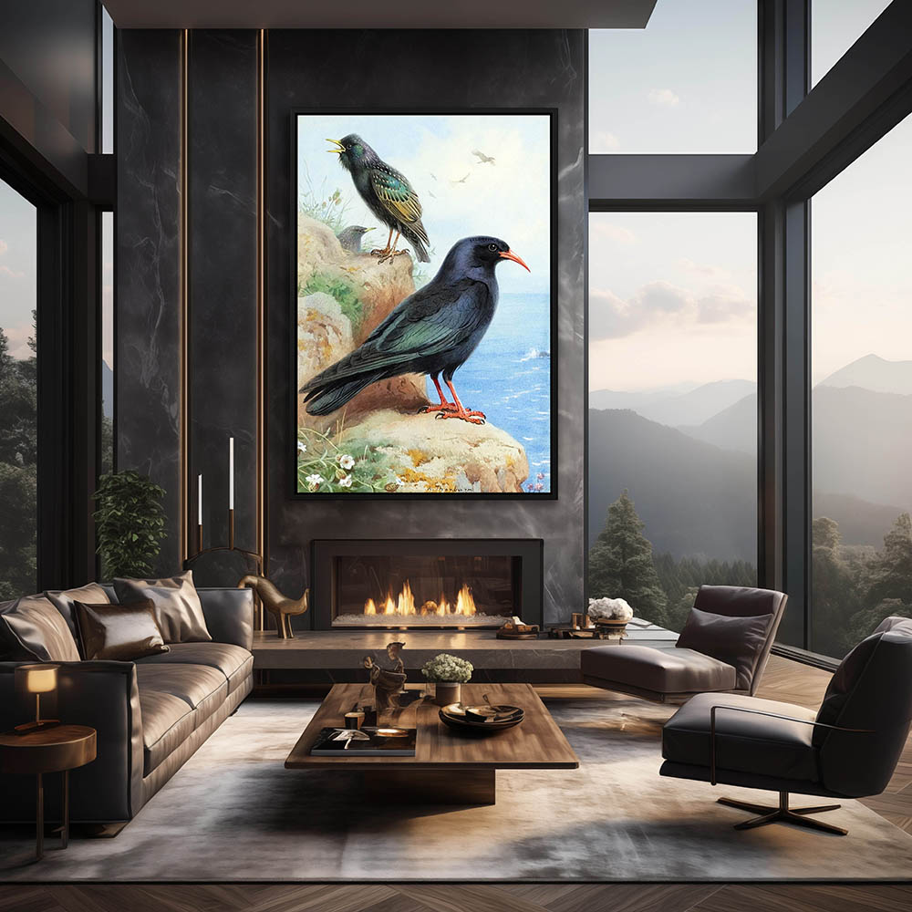 Painting of Crave and Starling Birds Resting on the Cliffs Overlooking the Sea
