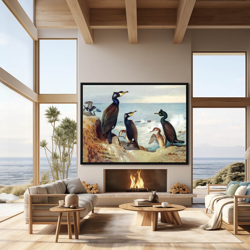 Painting of Cormorant Sea Birds on the Rocks on Shore