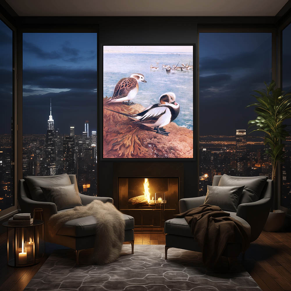Bird Painting Ducks Sitting on a Rock on Shore and Ducks Floating in the Sea