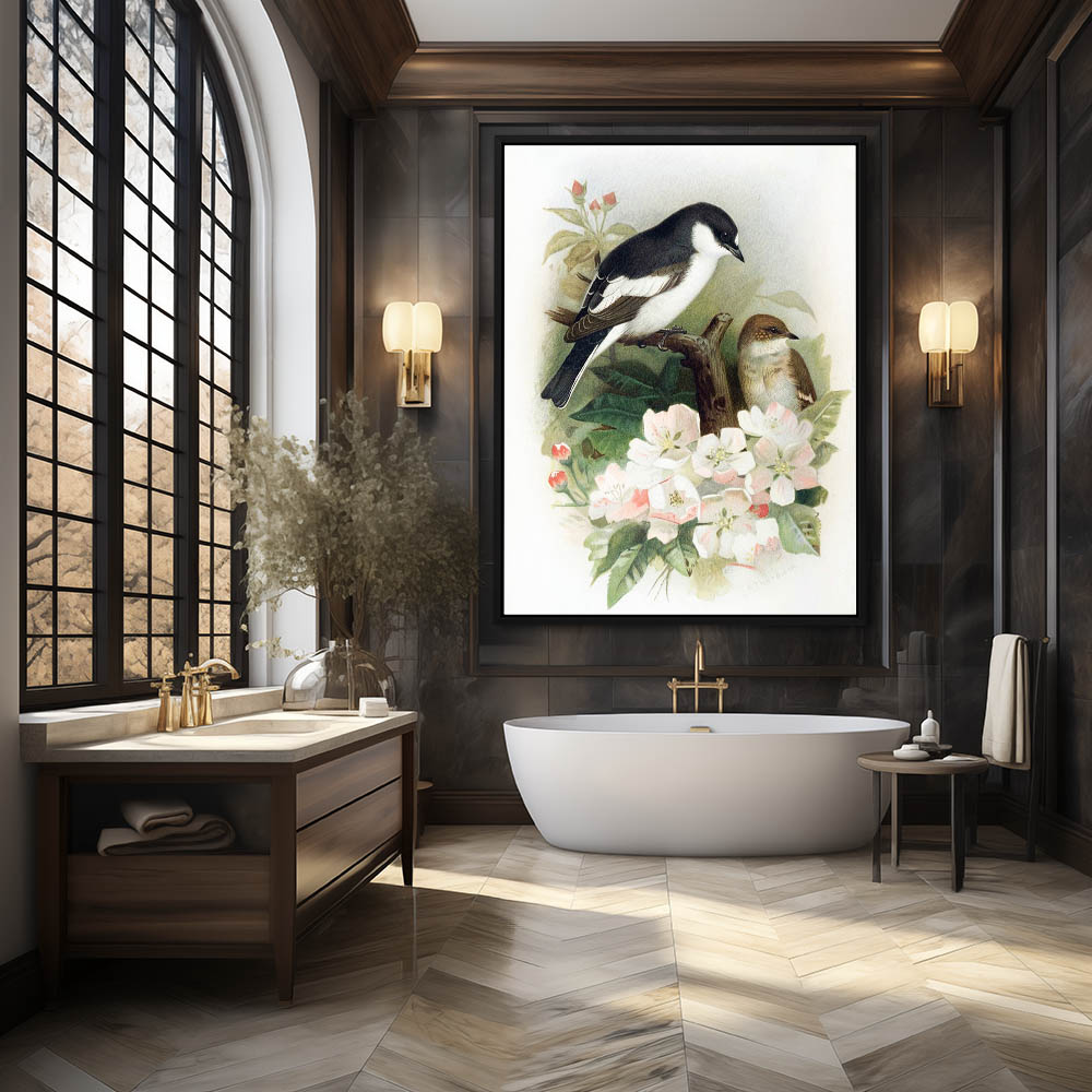 Painting of Two Flycatchers Perched on a Blooming Limb