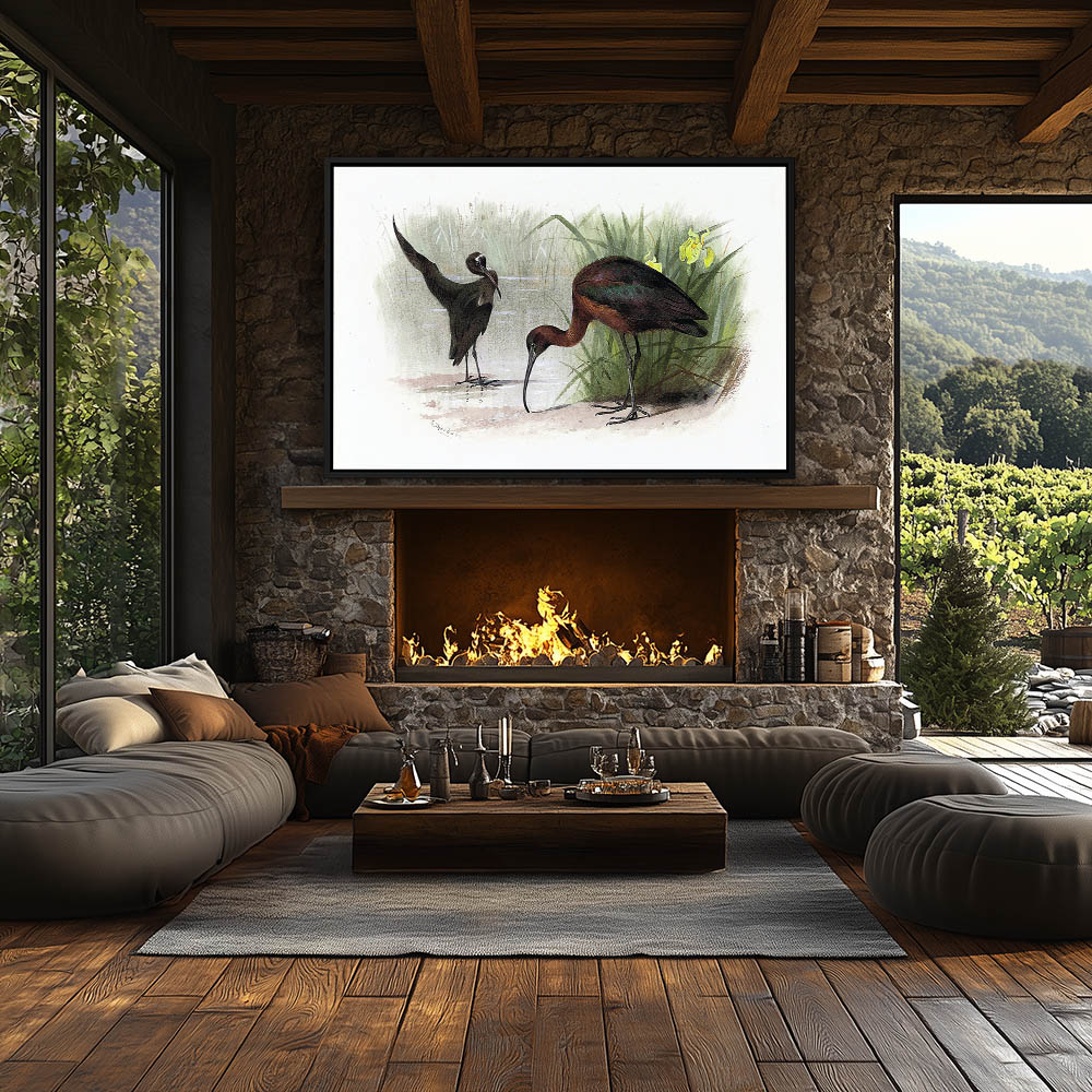 Painting of Glossy Ibis Birds on the Shore by the Reeds with Flowers