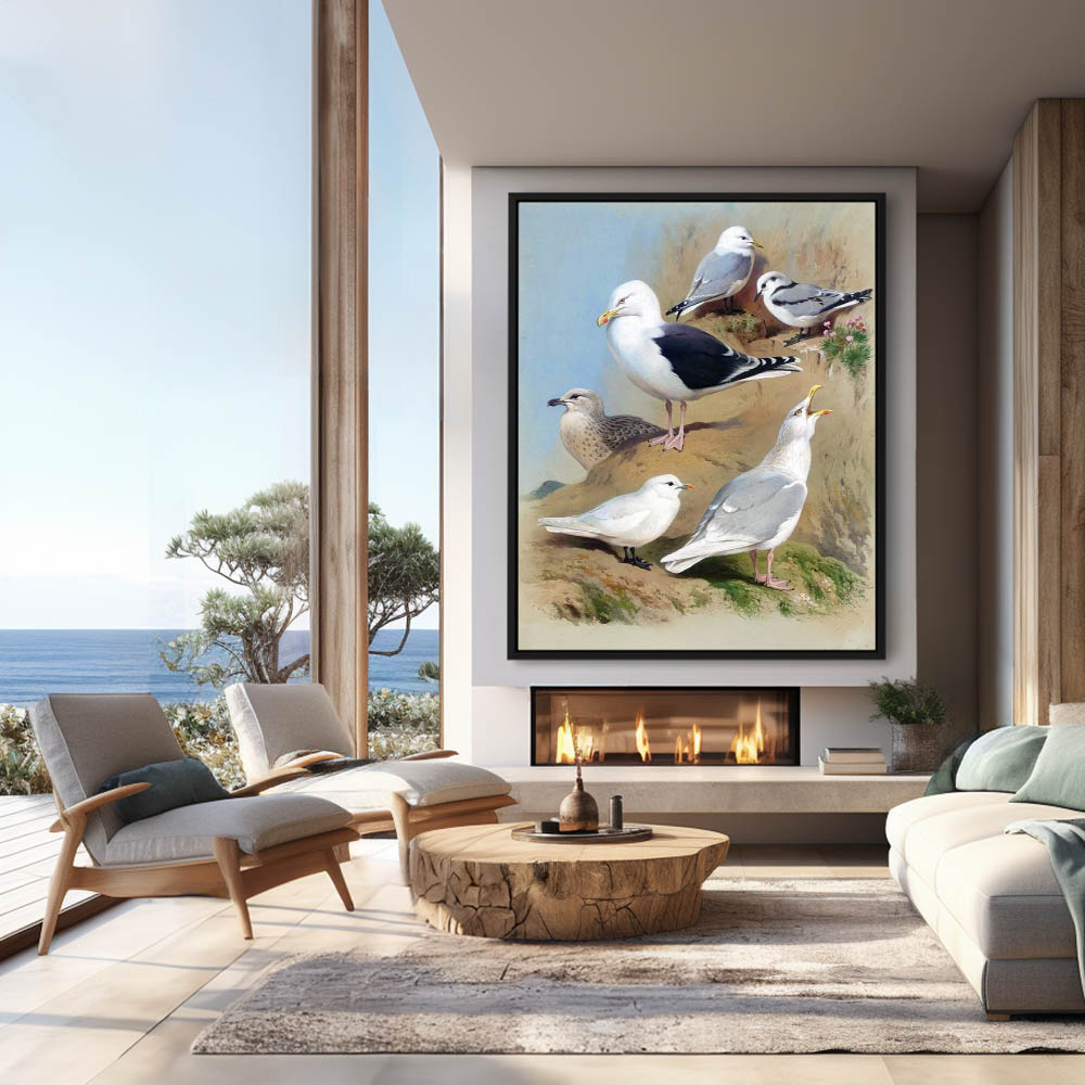 Painting of Various Gulls on the Cliffs on Shore
