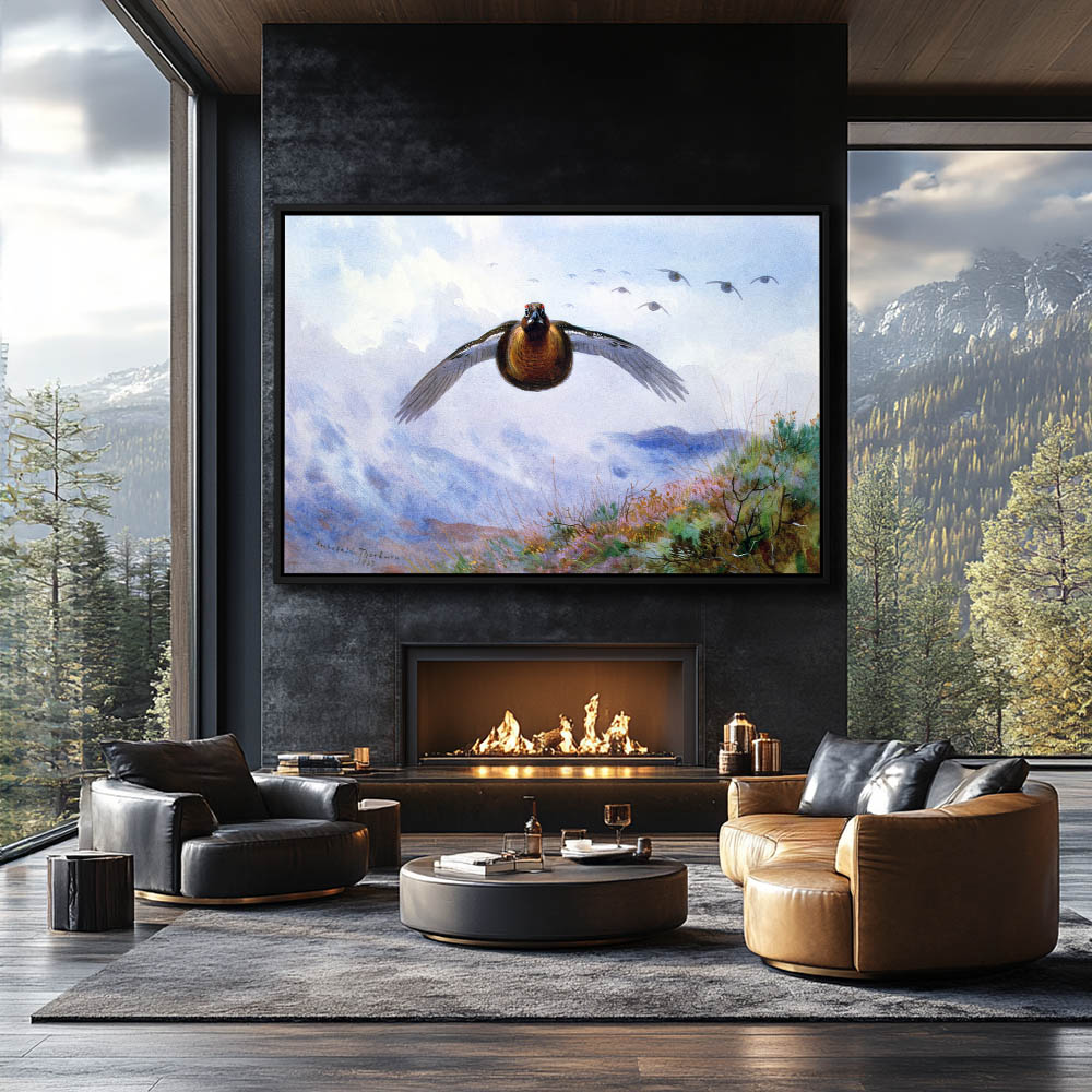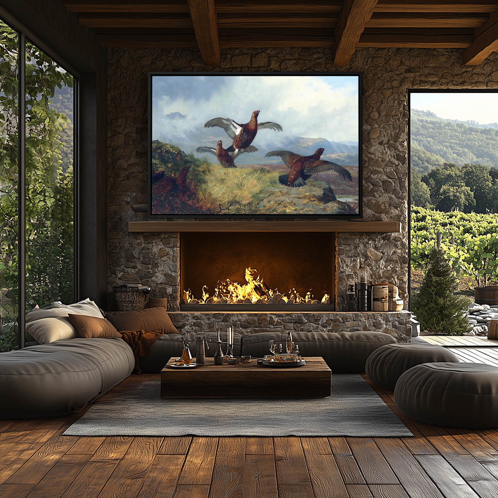 Mountain Landscape Painting with Grouse in Flight