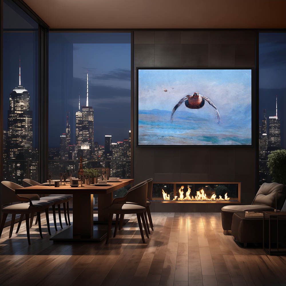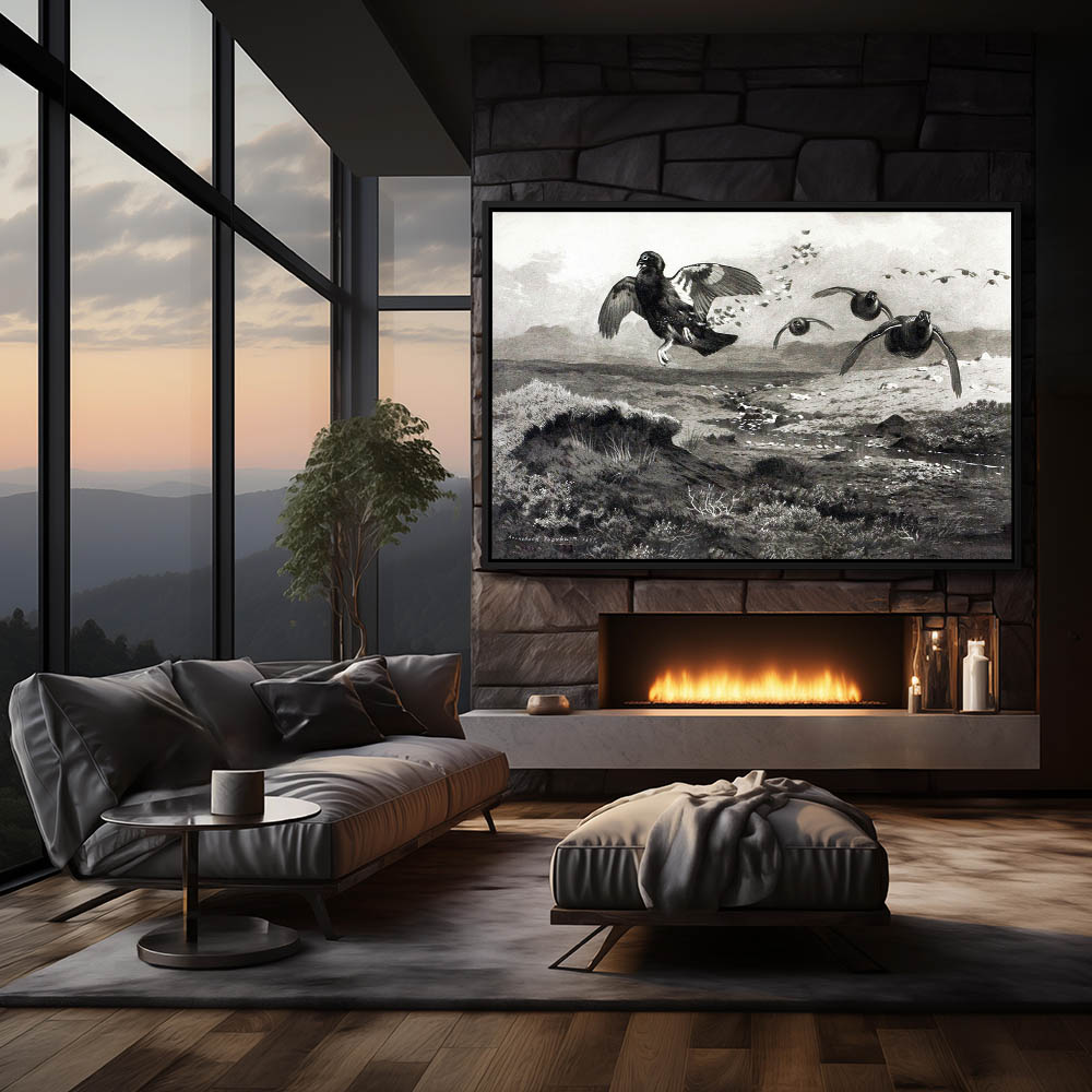 Painting of Grouse in Flight over the Landscape in the Mist