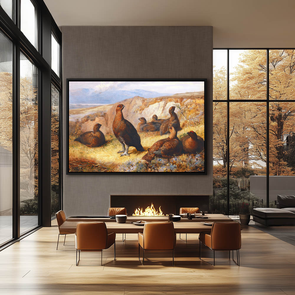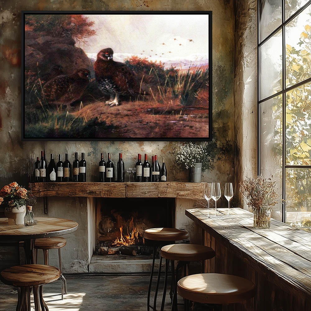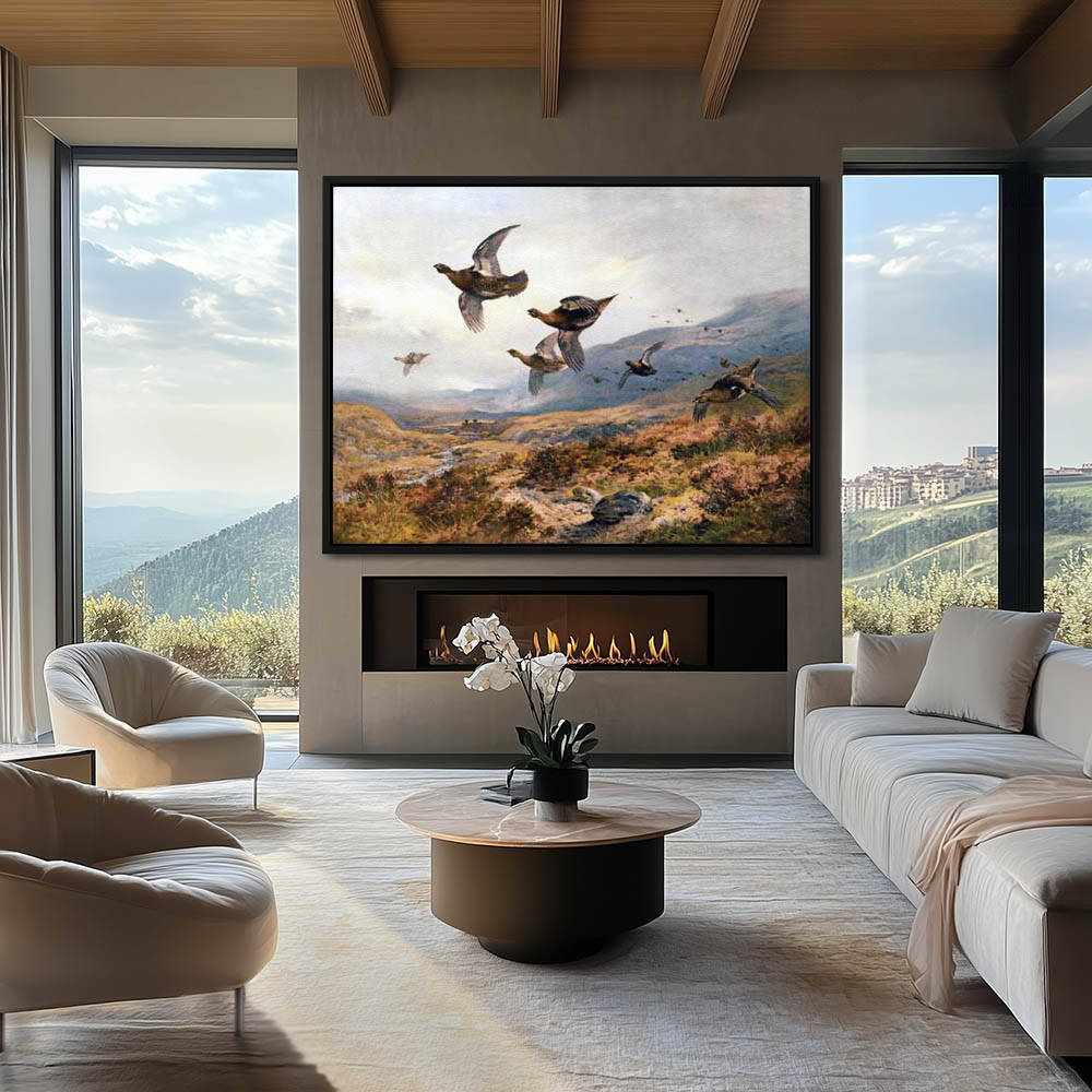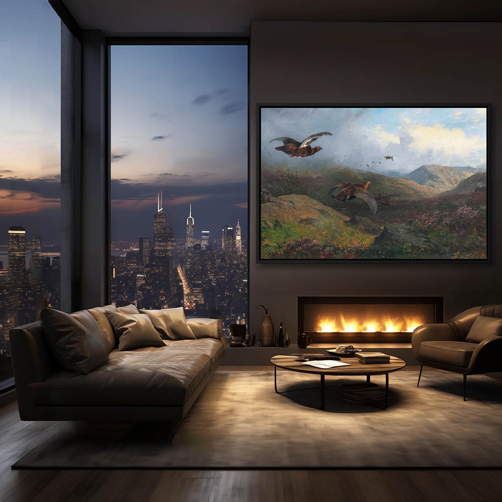 Open Highland Landscape Painting with Grouse in Flight