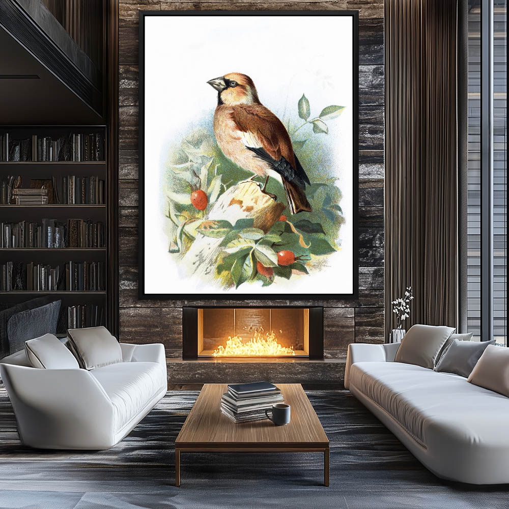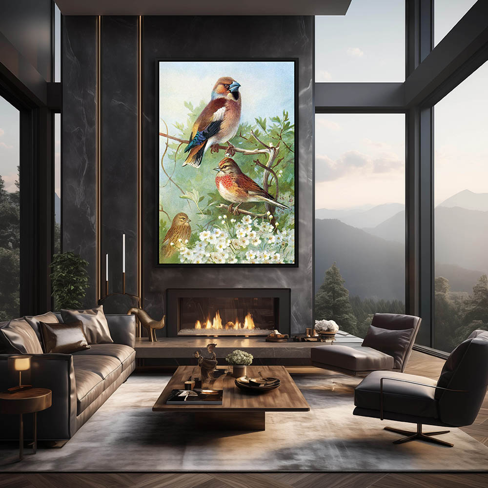 Painting Hawfinch Birds Perched on a Limb in Bloom